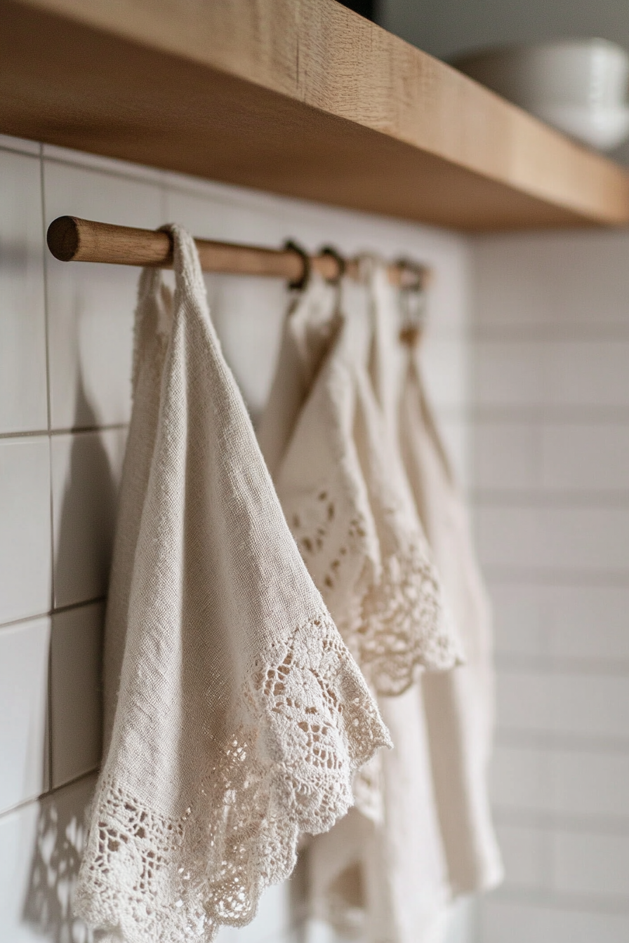 Vintage-inspired lace and linen tea towels lend a shabby chic touch to your kitchen décor and table settings.