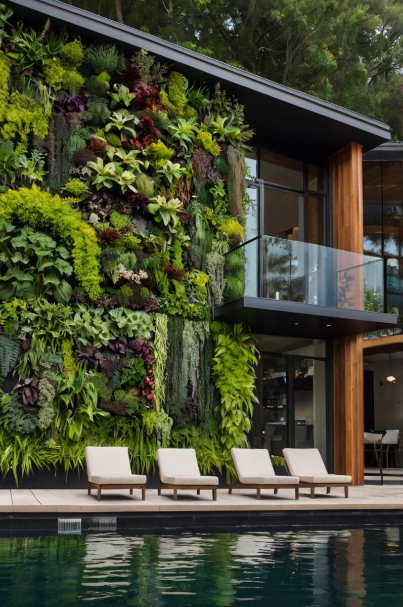 Transform blank exterior walls into stunning vertical gardens that create privacy while adding natural beauty to your lake house design.
