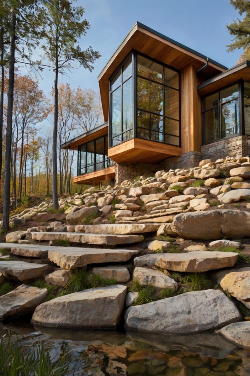 The irregular shapes and textures of natural rock provide perfect contrast to the straight lines and smooth surfaces of modern building materials.