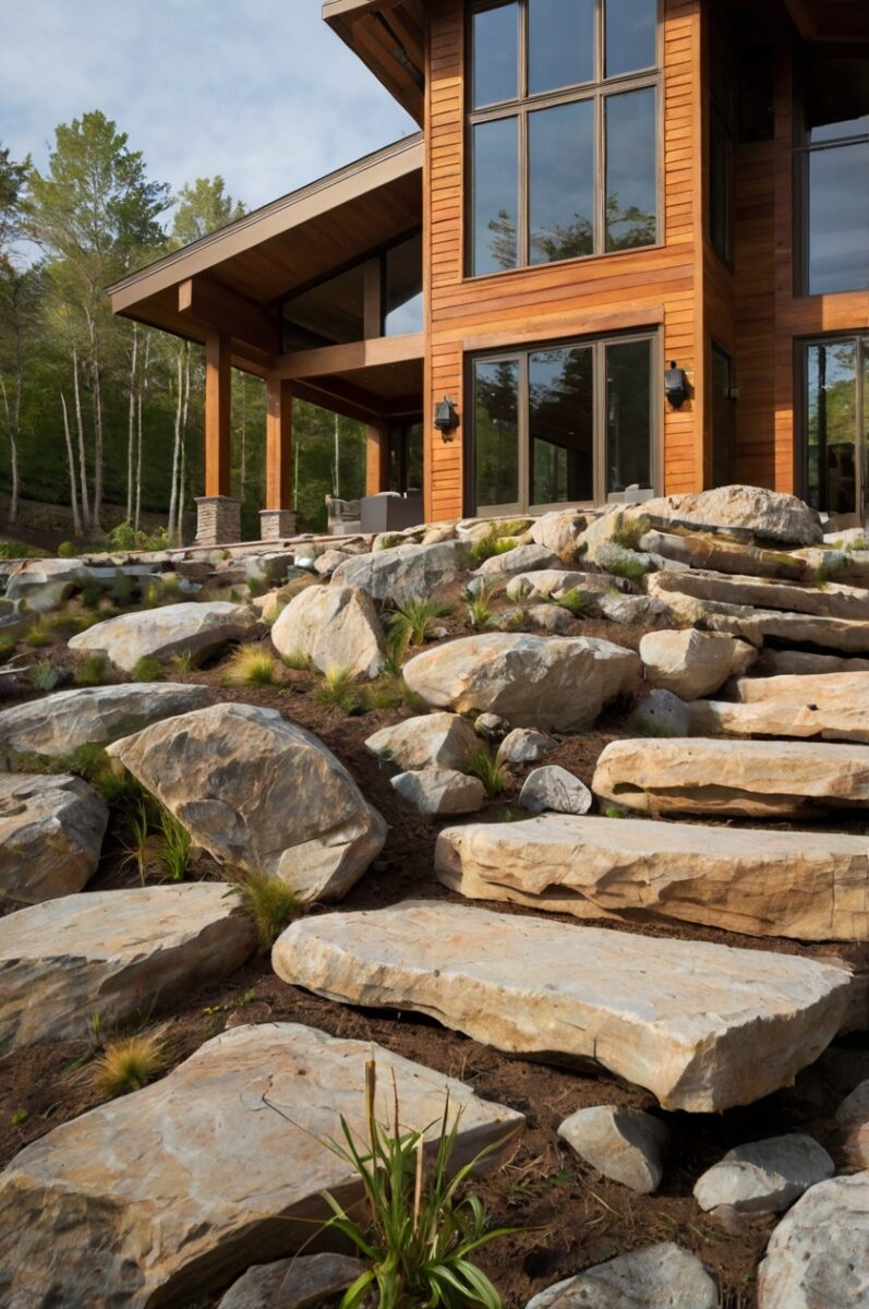 The thermal mass of large rock elements helps moderate temperature swings in adjacent interior spaces, improving energy efficiency naturally.