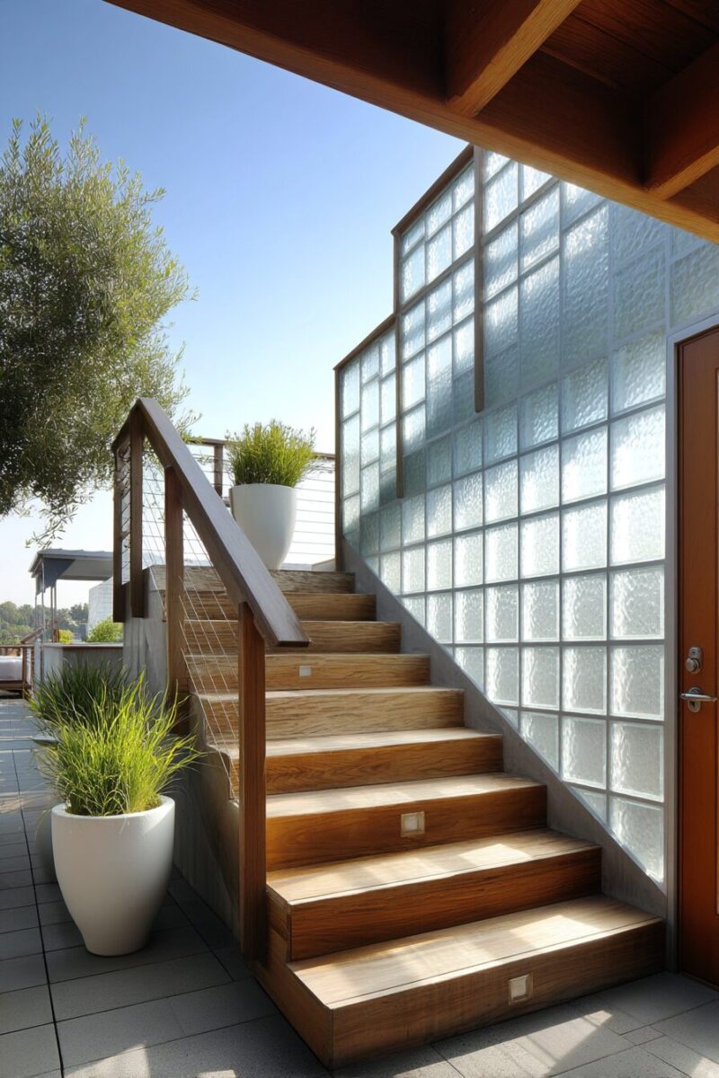 You’ll find that frosted glass diffuses light beautifully, allowing natural illumination to penetrate the under-deck area while maintaining privacy and visual screening.