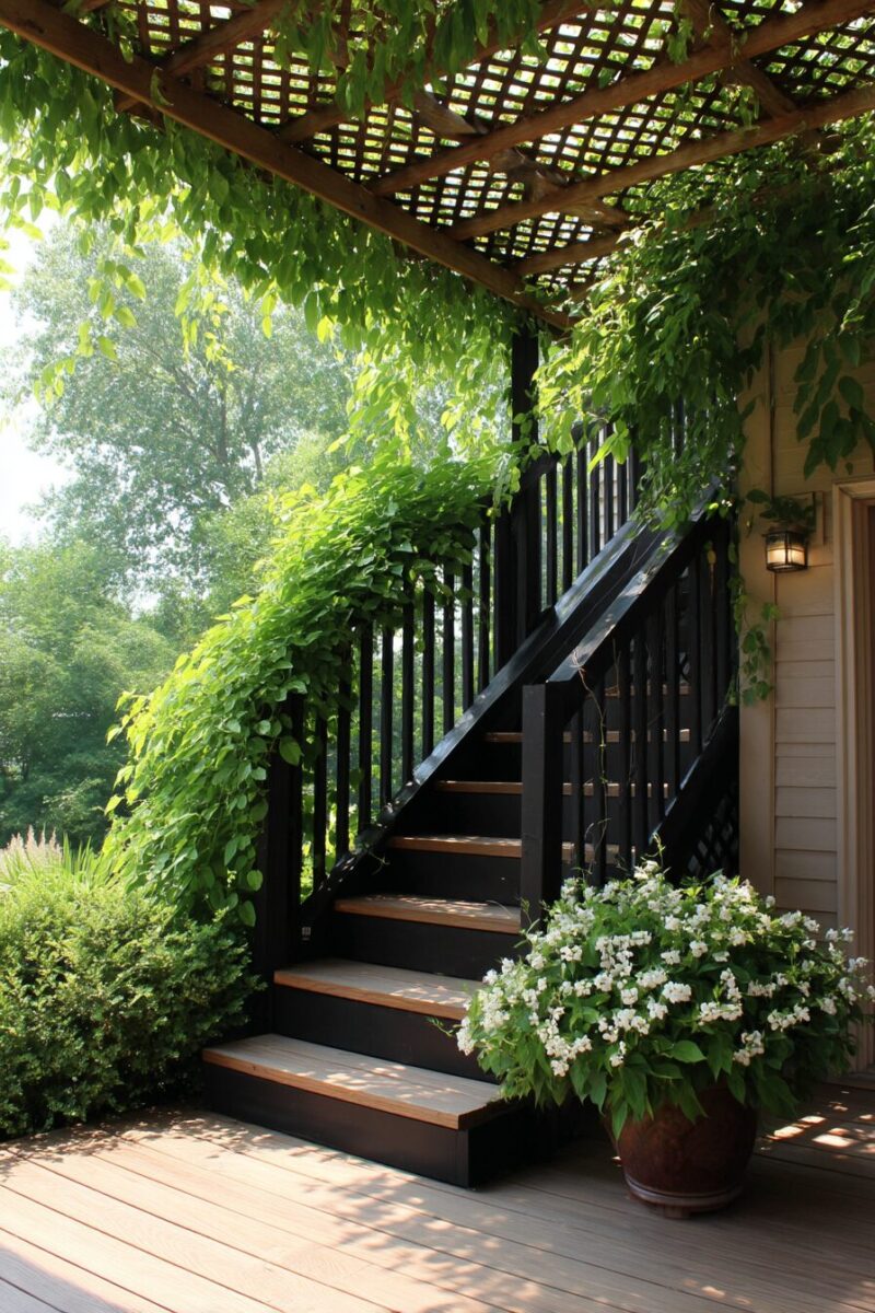 The combination of structured trellis work and organic plant growth creates a beautiful balance that softens the hard lines of deck architecture and connects it visually to the surrounding landscape.