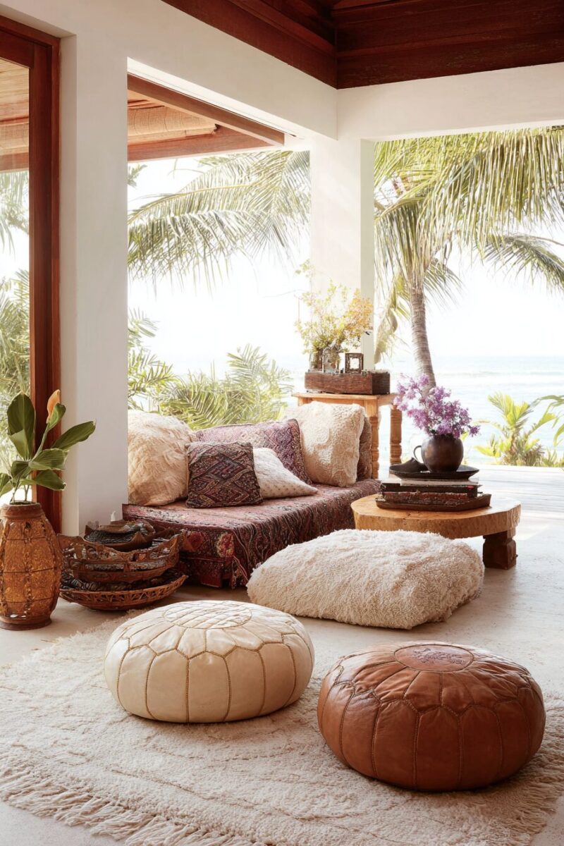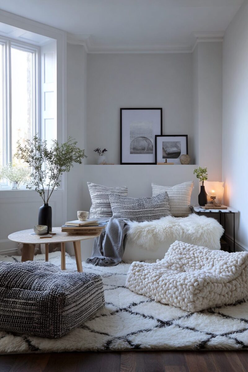 The key is choosing cushions in varying heights – some thin meditation pillows, some thick floor cushions, and a few medium-height poufs to create visual interest.