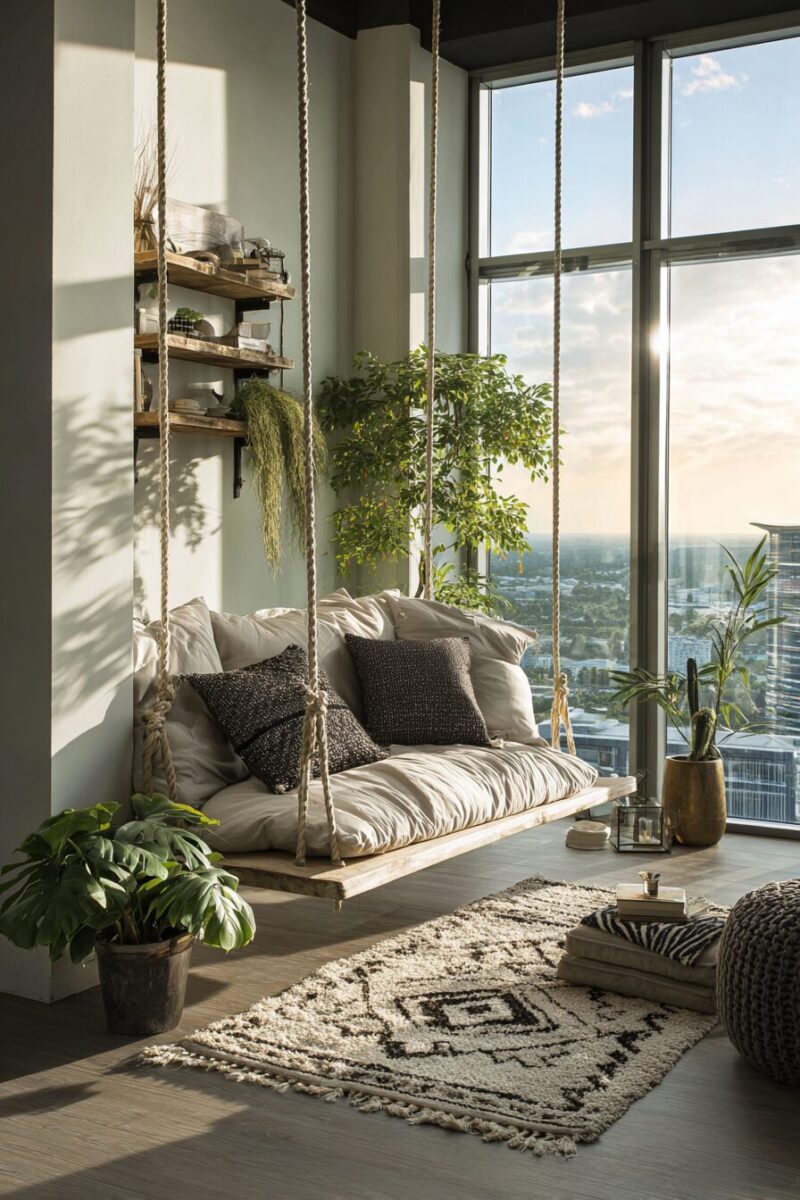 You can install a ceiling-mounted swing chair that becomes the focal point of your entire room, drawing eyes upward and making your space feel larger.