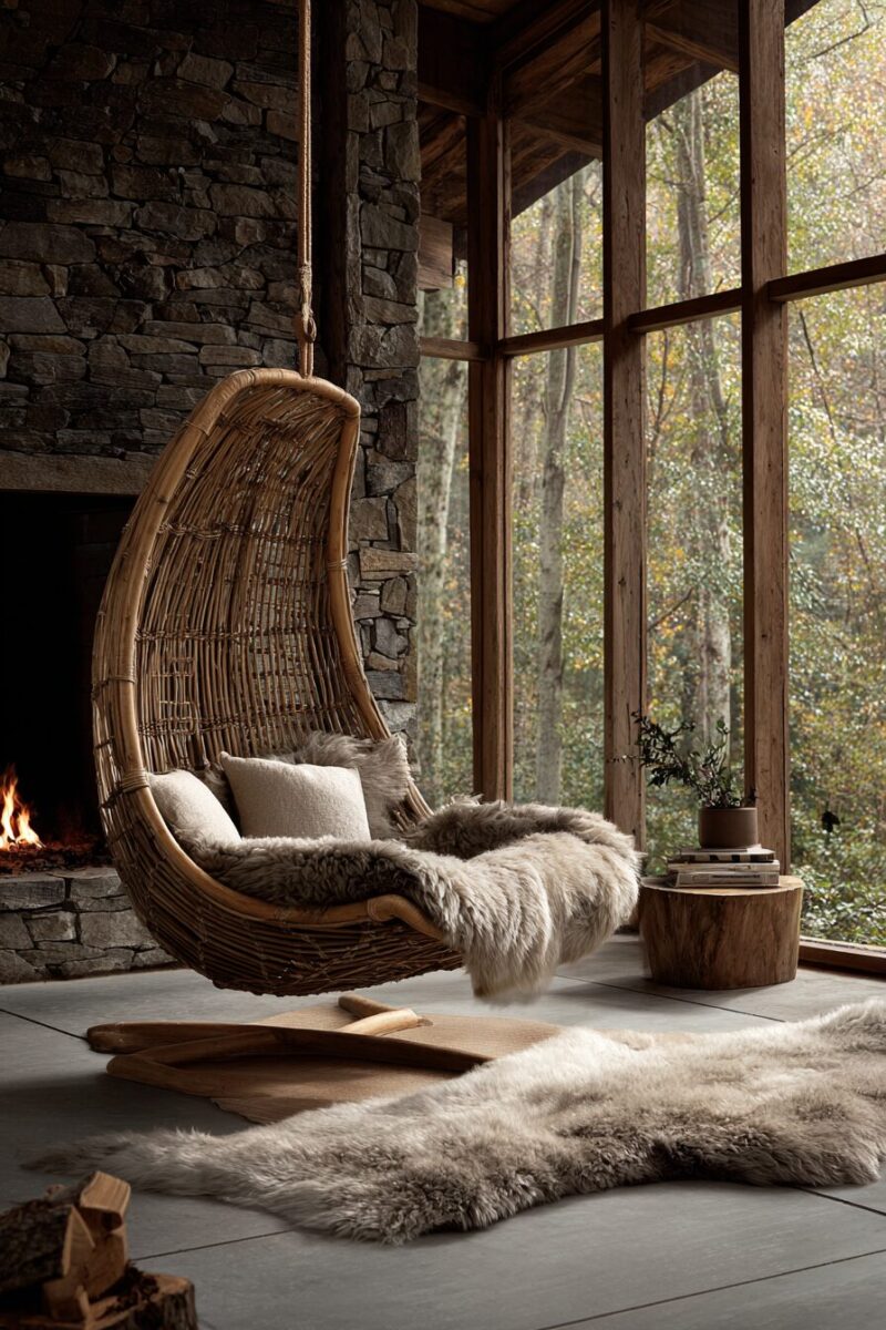 Lighting becomes crucial with hanging chairs; you want ambient lighting that highlights the chair’s silhouette while providing enough illumination for reading.