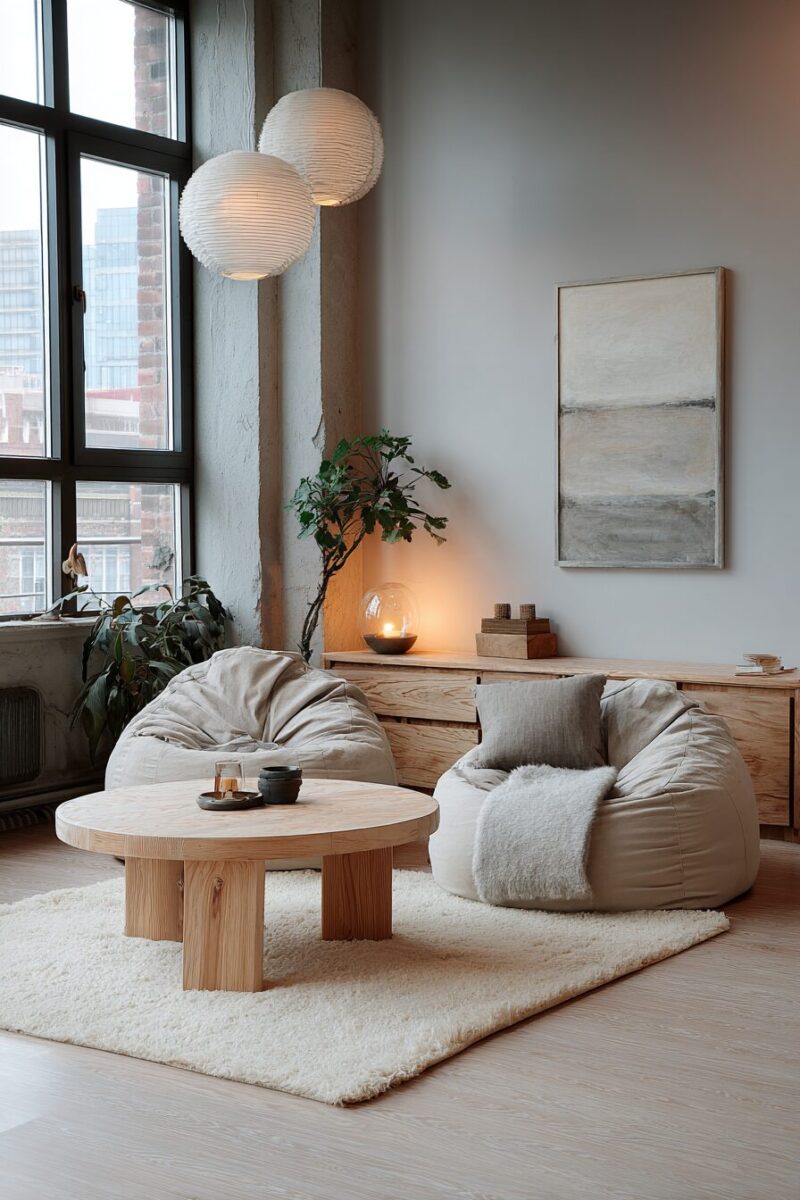 Pairing bean bags with a low Japanese-style floor table creates an intimate dining or working area that feels both casual and intentional.
