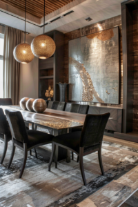 The dining room is dominated by a massive reclaimed wood table, surrounded by antique-inspired chairs for an authentic, aged feel.