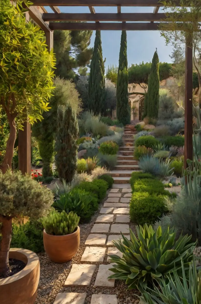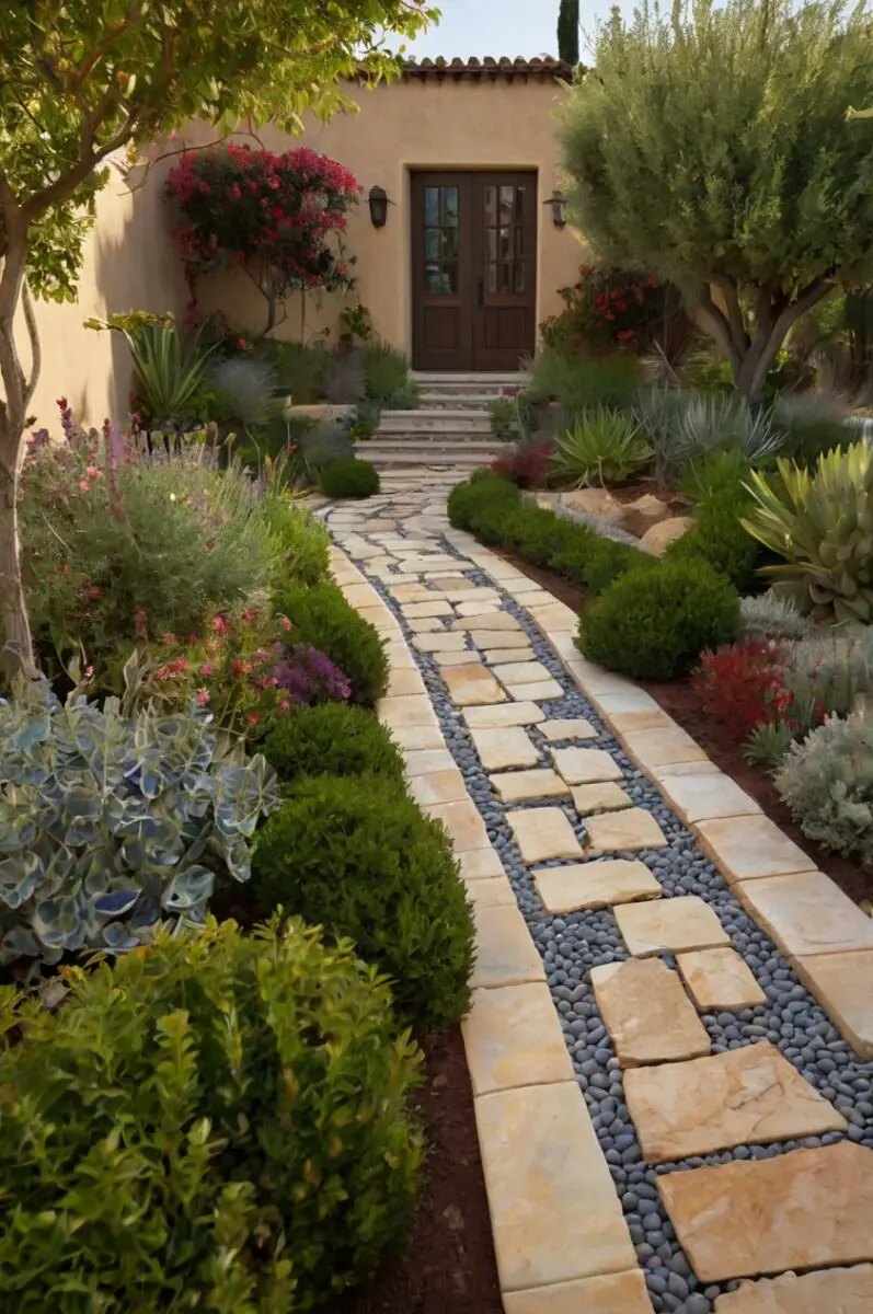 Choose pathway materials that complement your home’s architecture and existing hardscape – natural stone, brick, decomposed granite, or gravel in warm Mediterranean tones.