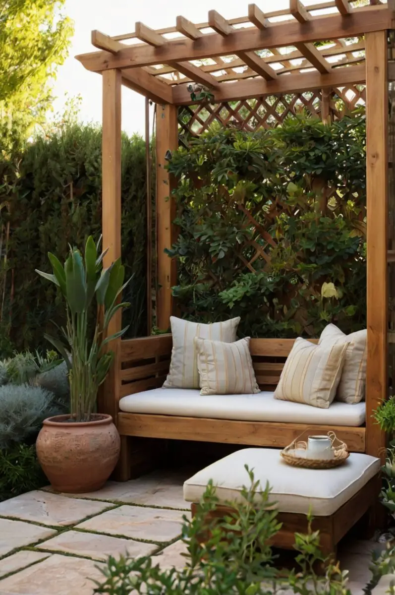 Add privacy screening using tall plantings, decorative screens, or trellises covered with climbing vines that create enclosure without feeling cramped.