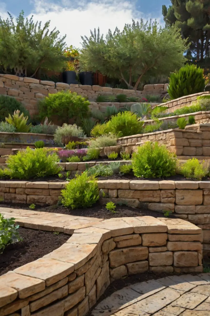 Plant each level with appropriate vegetation based on exposure and drainage – drought-tolerant natives on upper terraces, and slightly more water-loving plants below.