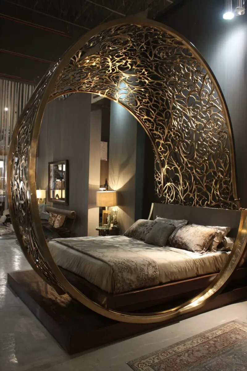 You’ll soften your bedroom’s entire atmosphere with curved and rounded metal bed frames that replace harsh angles with graceful flowing lines that create a sense of movement and organic beauty.