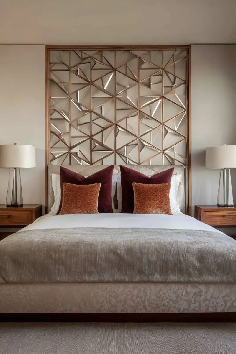 You can use lighting strategically to enhance the geometric effects – wall sconces positioned to cast dramatic shadows, or LED strips behind the headboard that create a glowing outline effect.