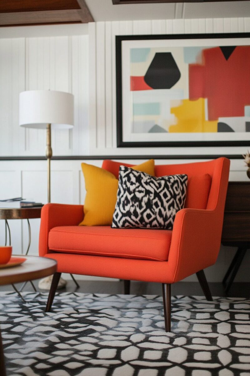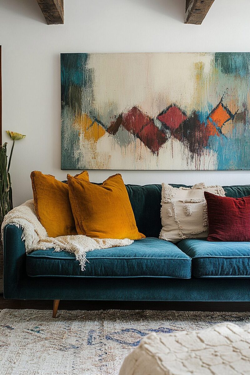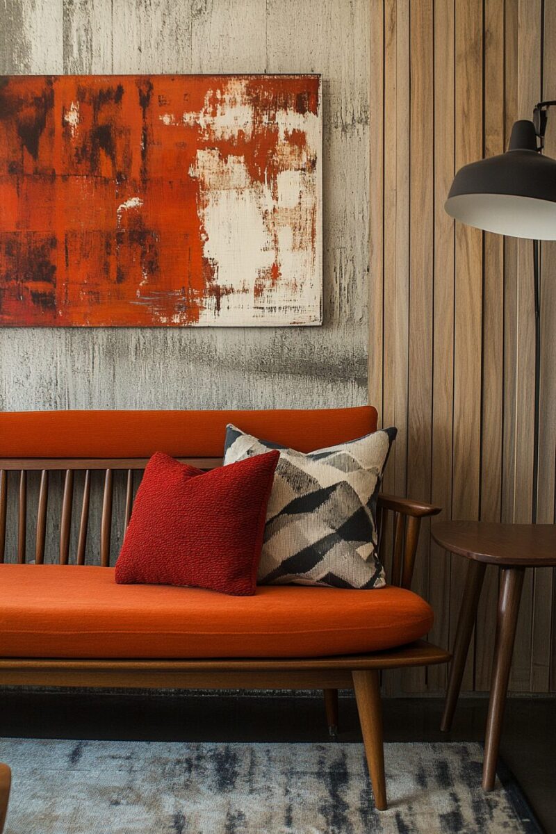 Art is the perfect vehicle for introducing these characteristic colors – look for abstract pieces, vintage travel posters, or geometric prints that incorporate the distinctive mid-century palette.