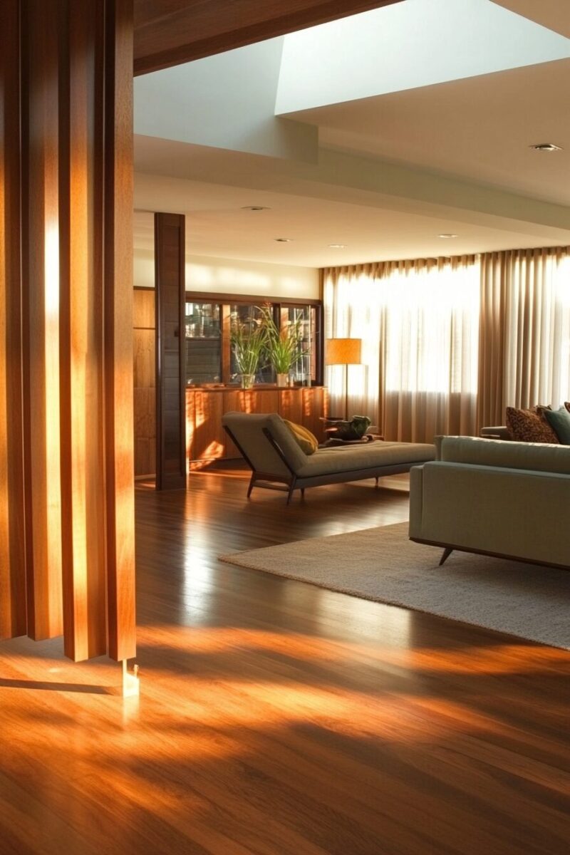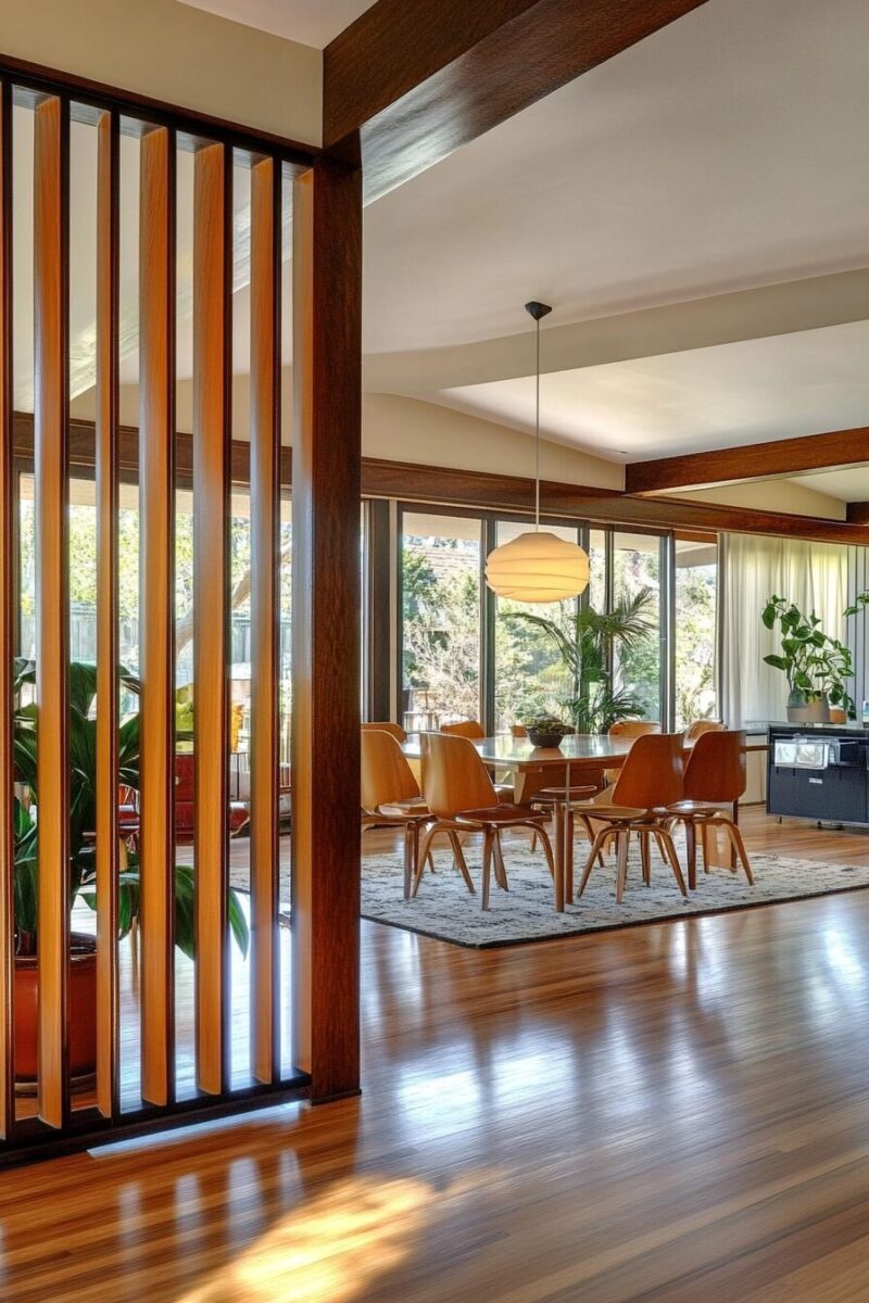 Don’t overlook the ceiling as a defining element – mid-century homes often featured different ceiling heights or treatments to distinguish between spaces while maintaining openness.