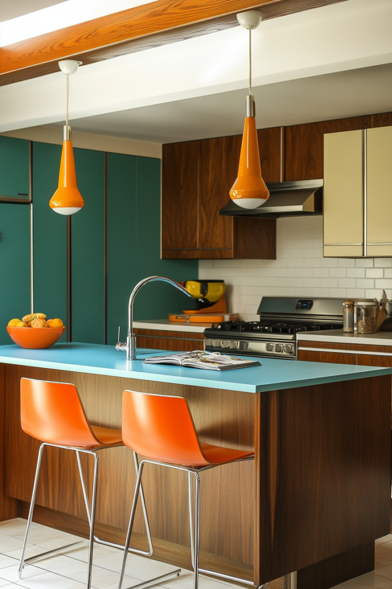 You can start with bold hues like mustard yellow, teal, or avocado green to bring that retro touch to your kitchen.