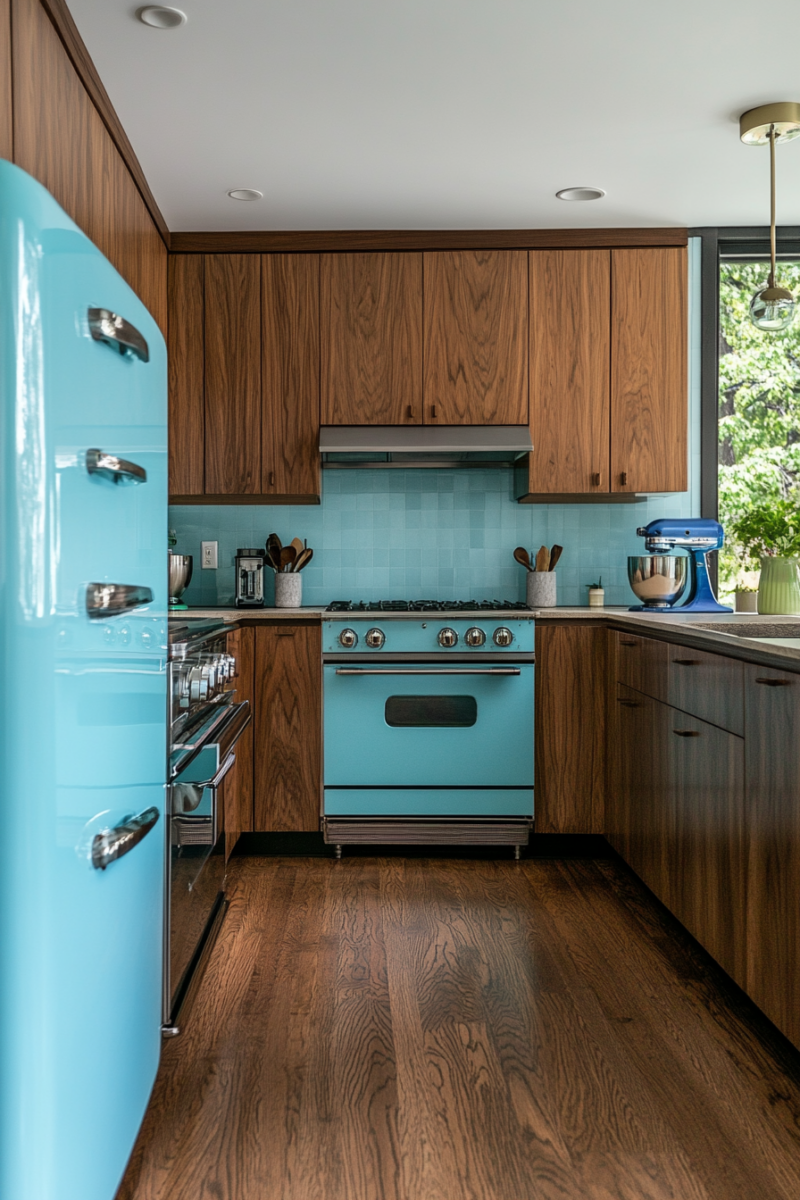 Retro appliances work beautifully alongside other mid-century elements like wooden cabinets and geometric backsplashes.