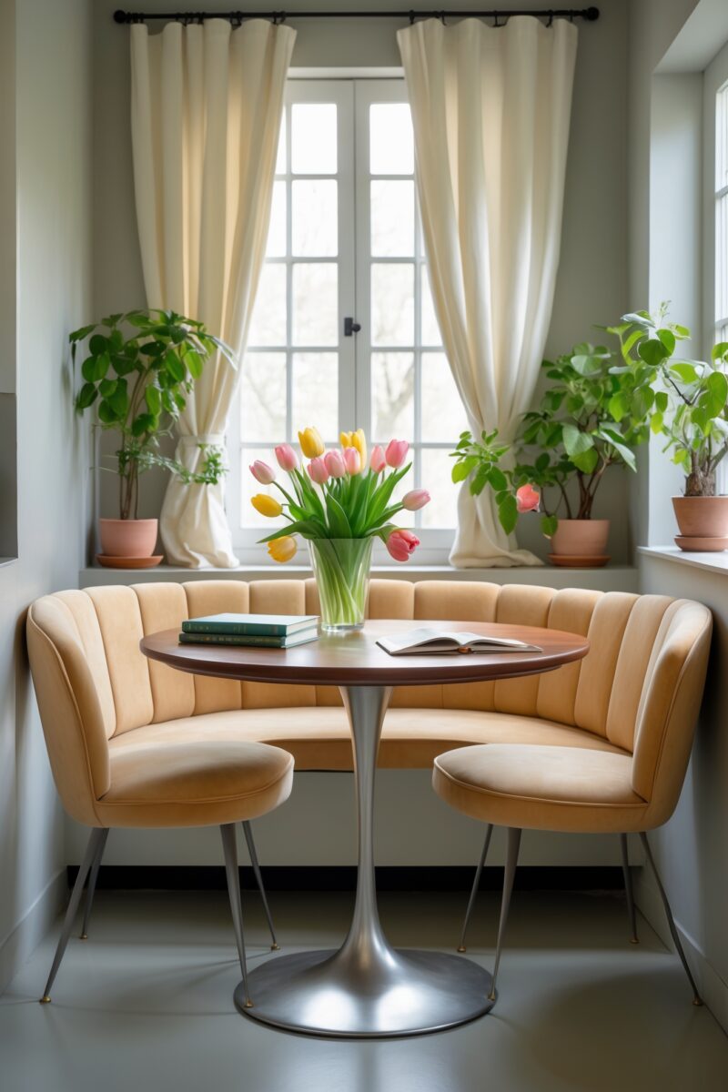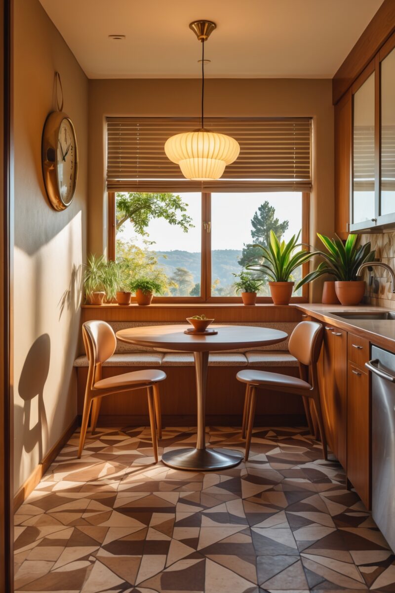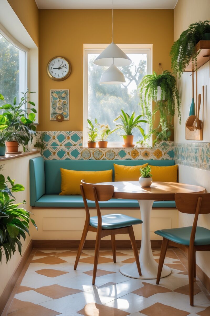 A cozy little breakfast nook nestled under a window in the corner incorporates retro charm.