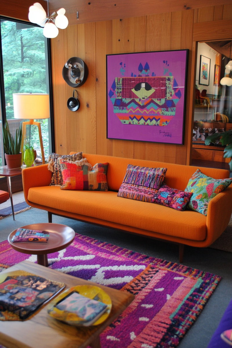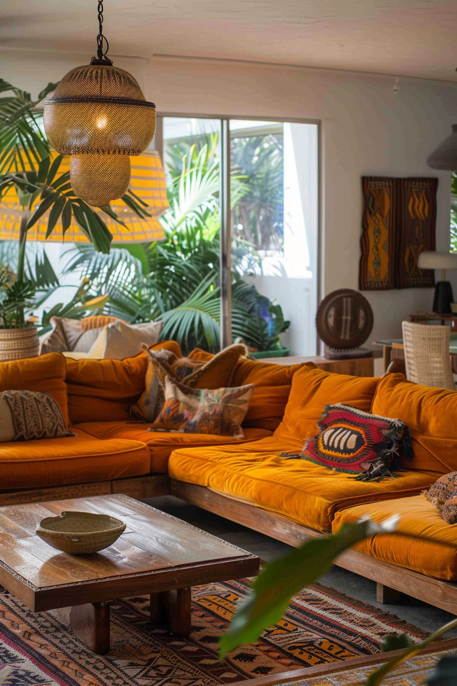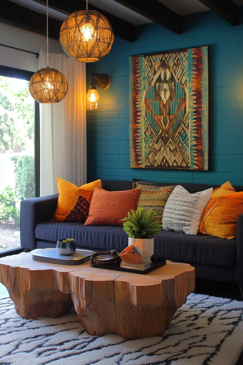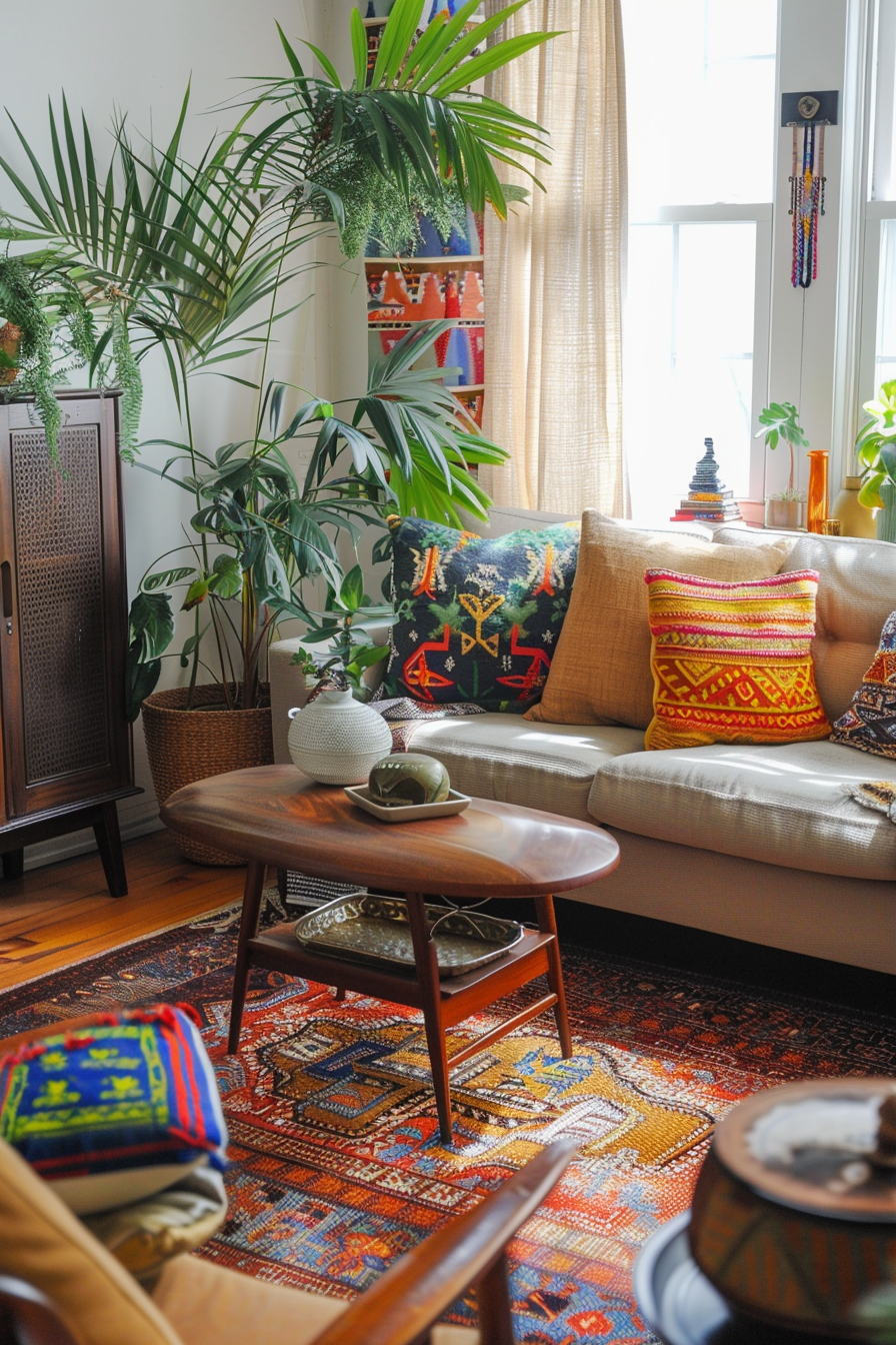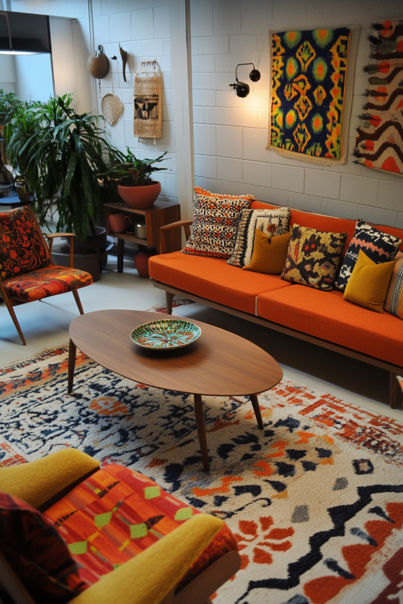 Mixing midcentury modern and bohemian patterns is a fun and creative way to add visual interest and personality to your midmod-boho living room.