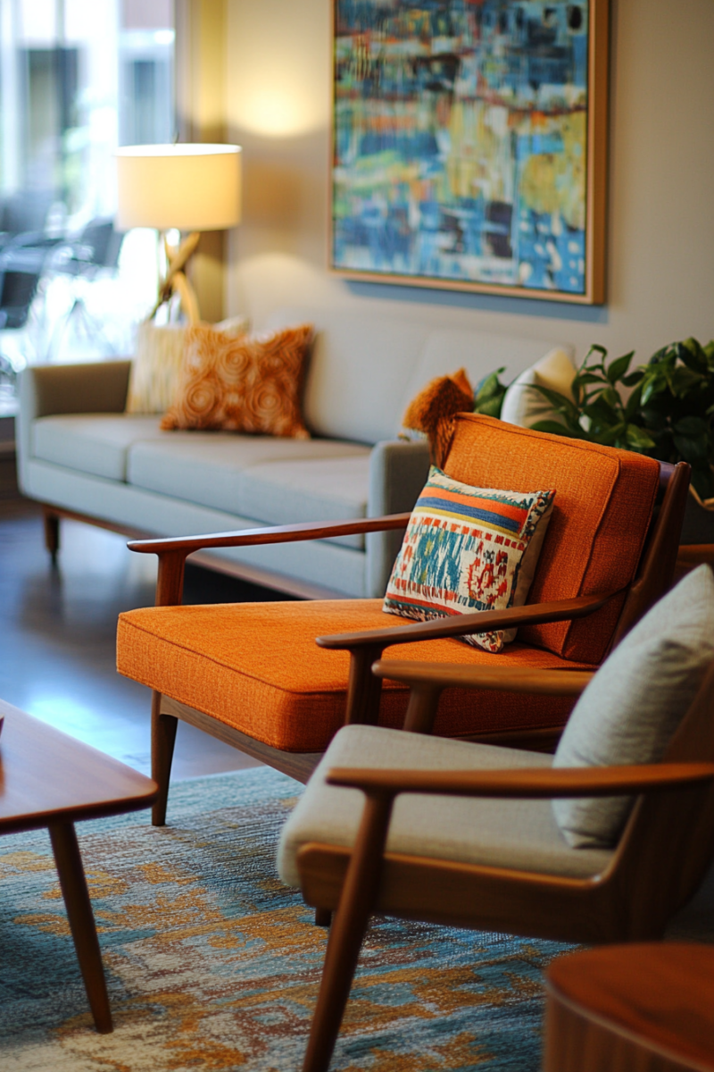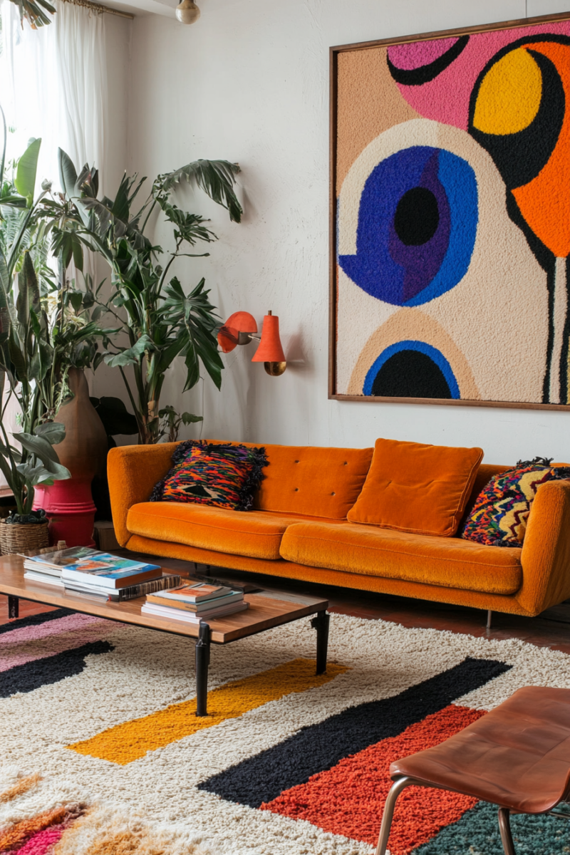 While midmod-boho style often leans towards a neutral color palette, don’t be afraid to inject pops of vibrant color to enliven your living room.