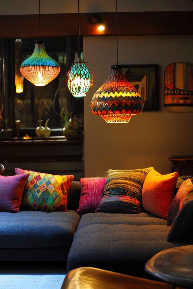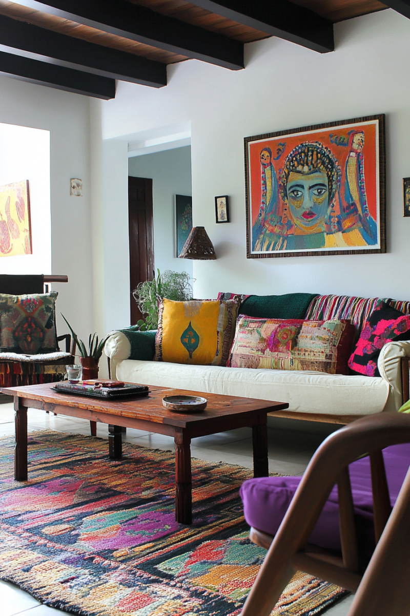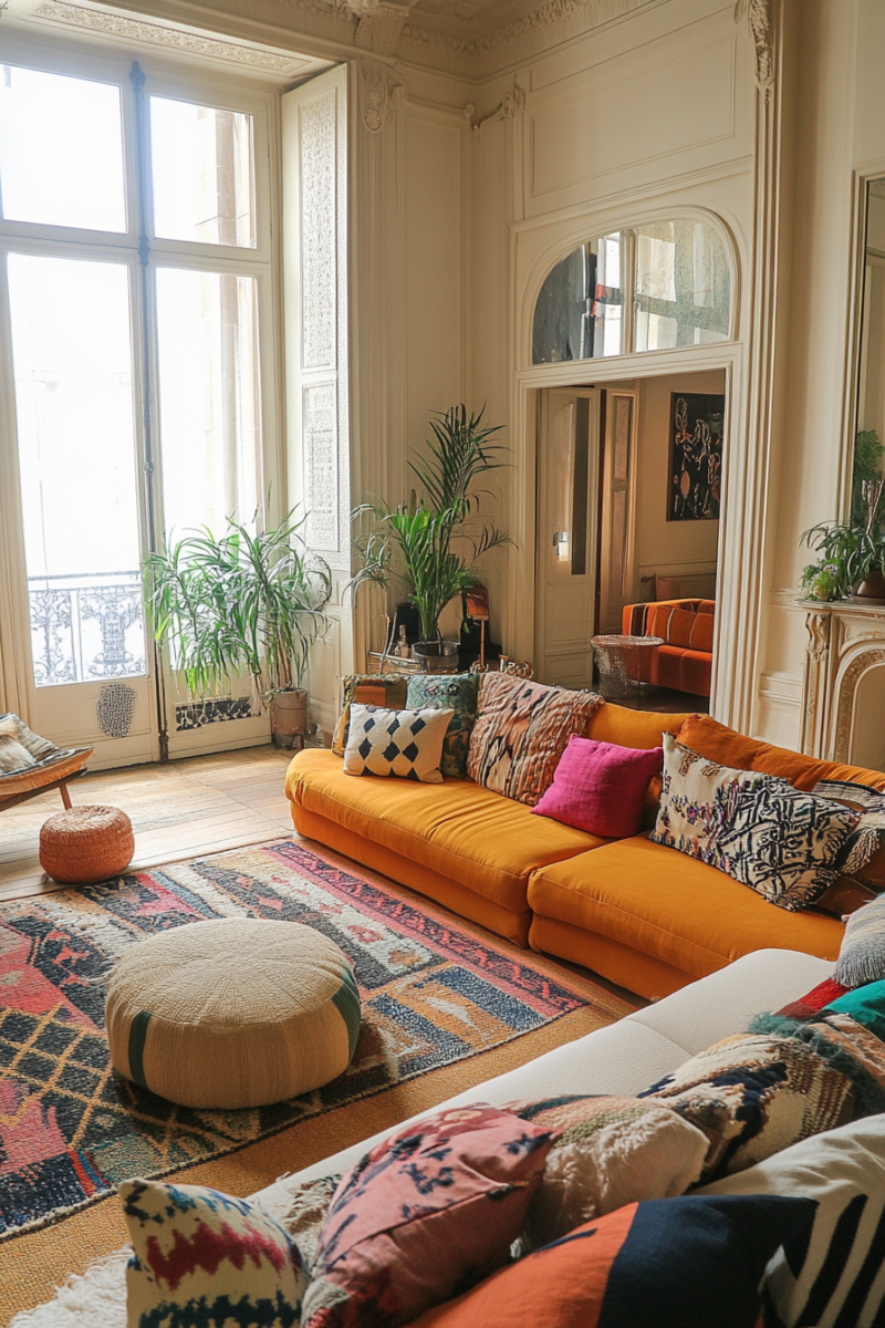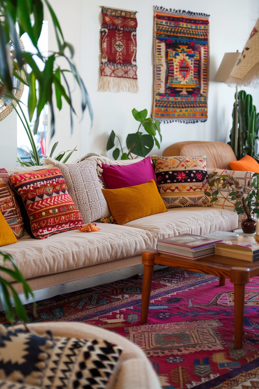 Scatter colorful throw pillows on your sofa and armchairs, mixing and matching patterns like ikat, suzani, and geometric designs.