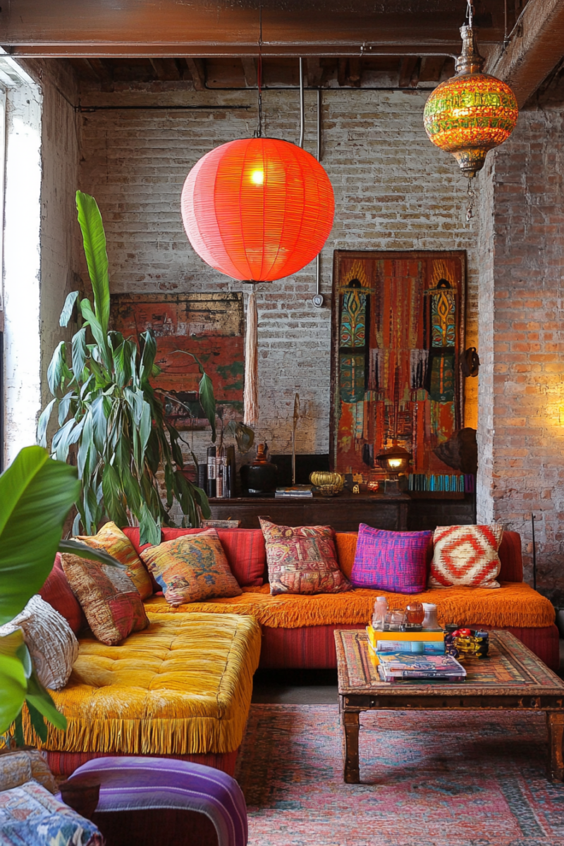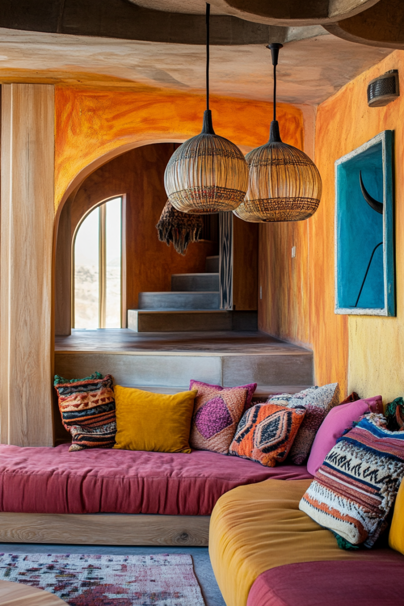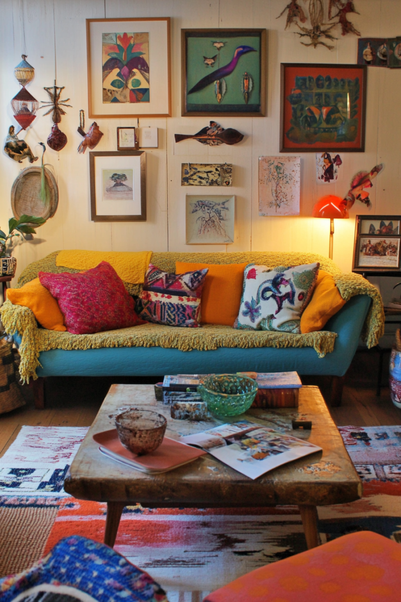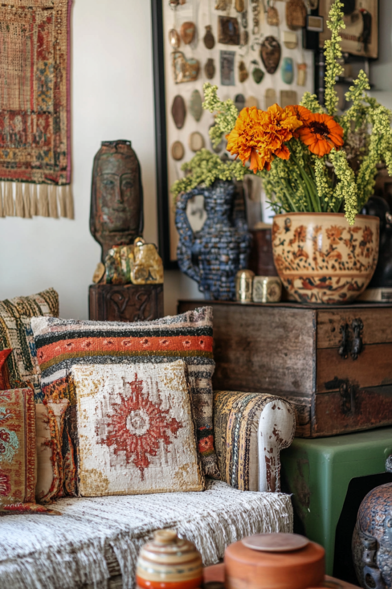 Scatter colorful throw pillows on your sofa and armchairs, mixing and matching patterns like ikat, suzani, and geometric designs.