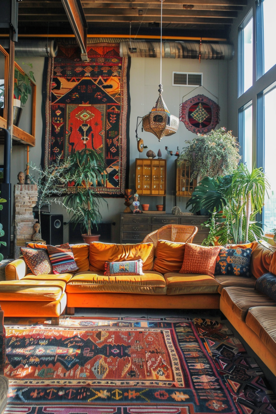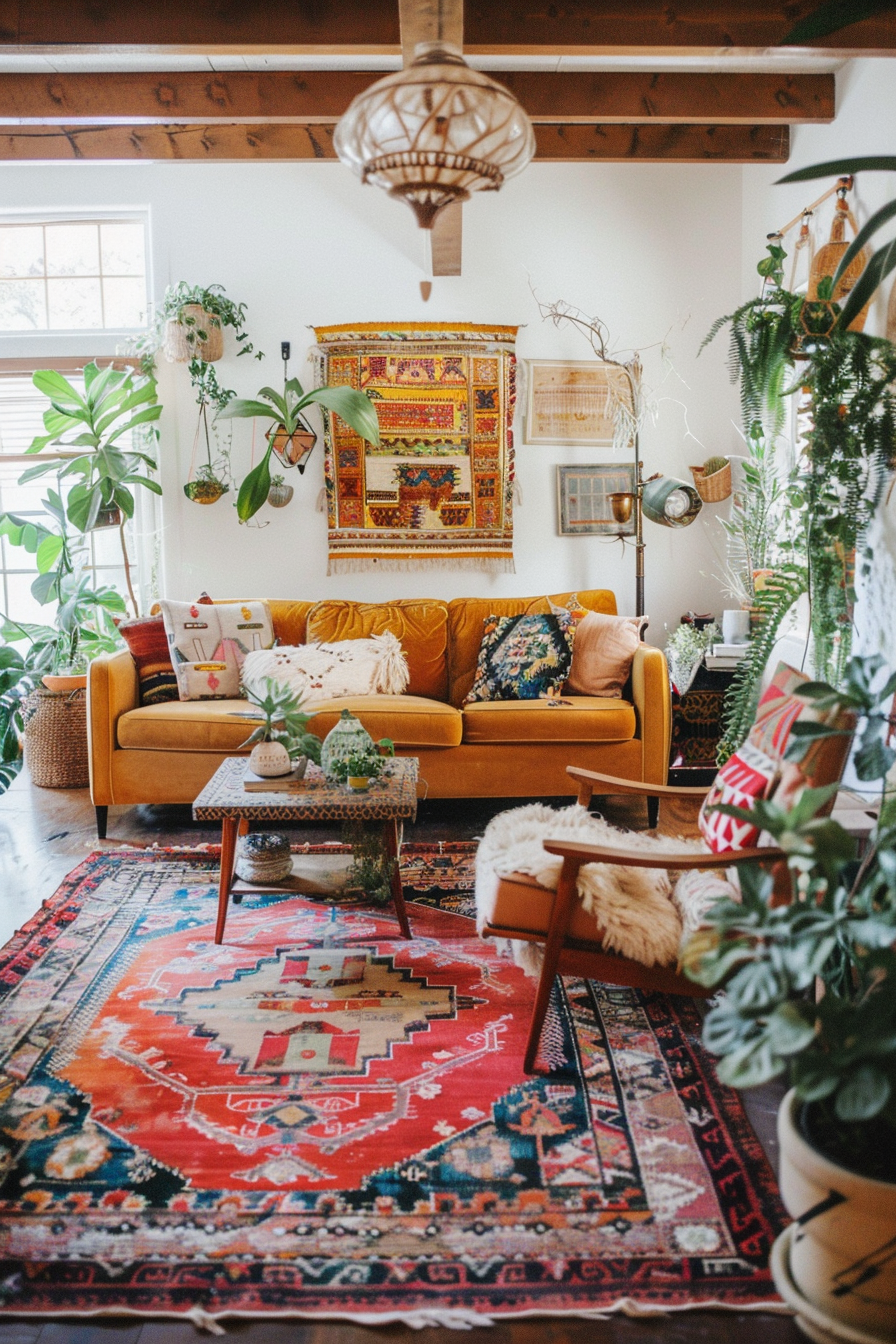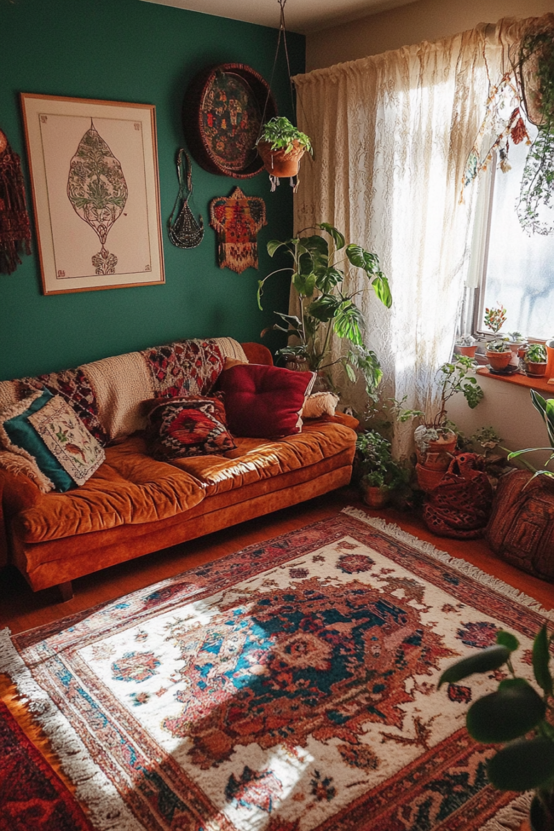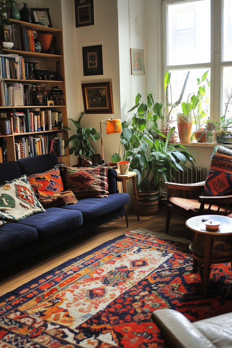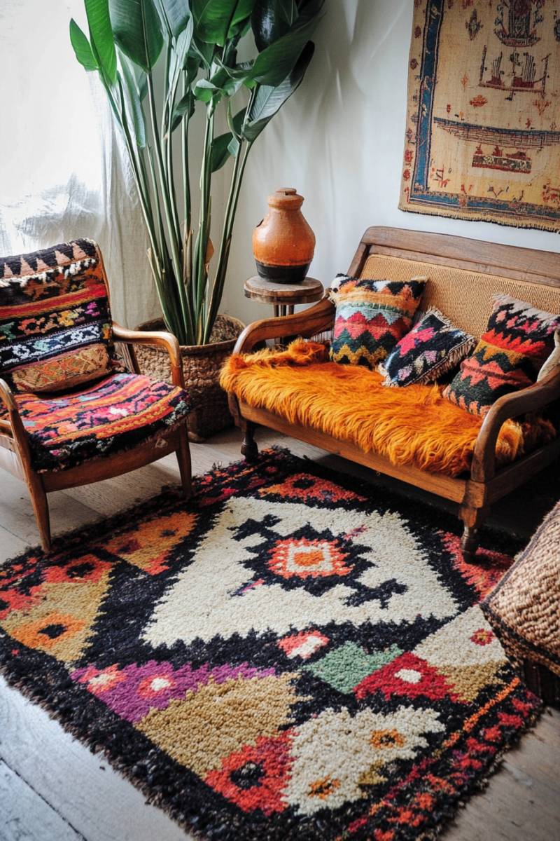 Persian, Turkish, or Moroccan rugs are excellent choices, as they often feature intricate designs and rich hues that perfectly embody the bohemian aesthetic.