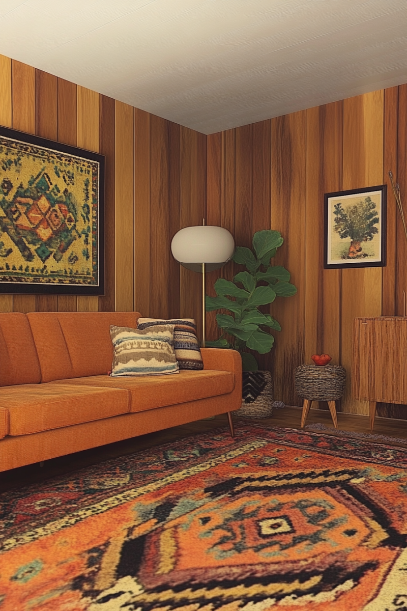 To further enhance the midmod vibe, consider layering a smaller, solid-colored rug on top of your vintage rug, creating a playful and unexpected contrast that showcases the best of both styles.