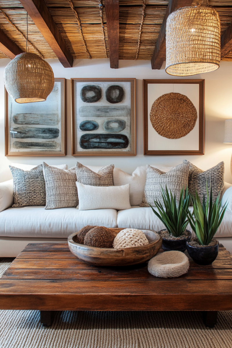 A sleek, metal wall sculpture or a set of framed abstract prints will create a beautiful contrast against the soft, textural backdrop of your woven pieces.