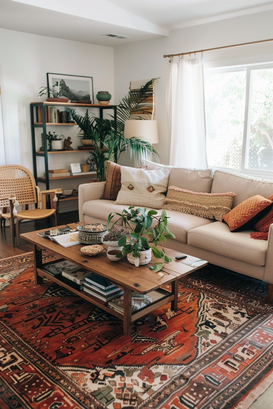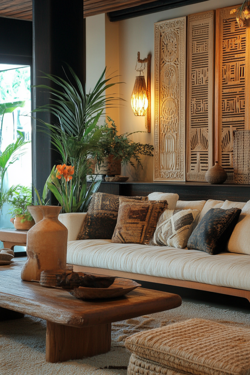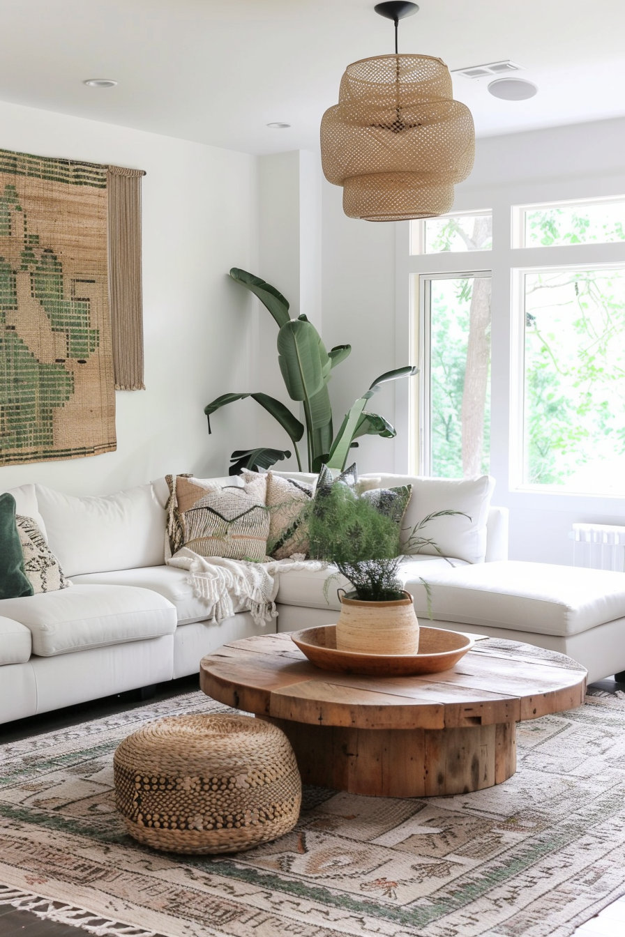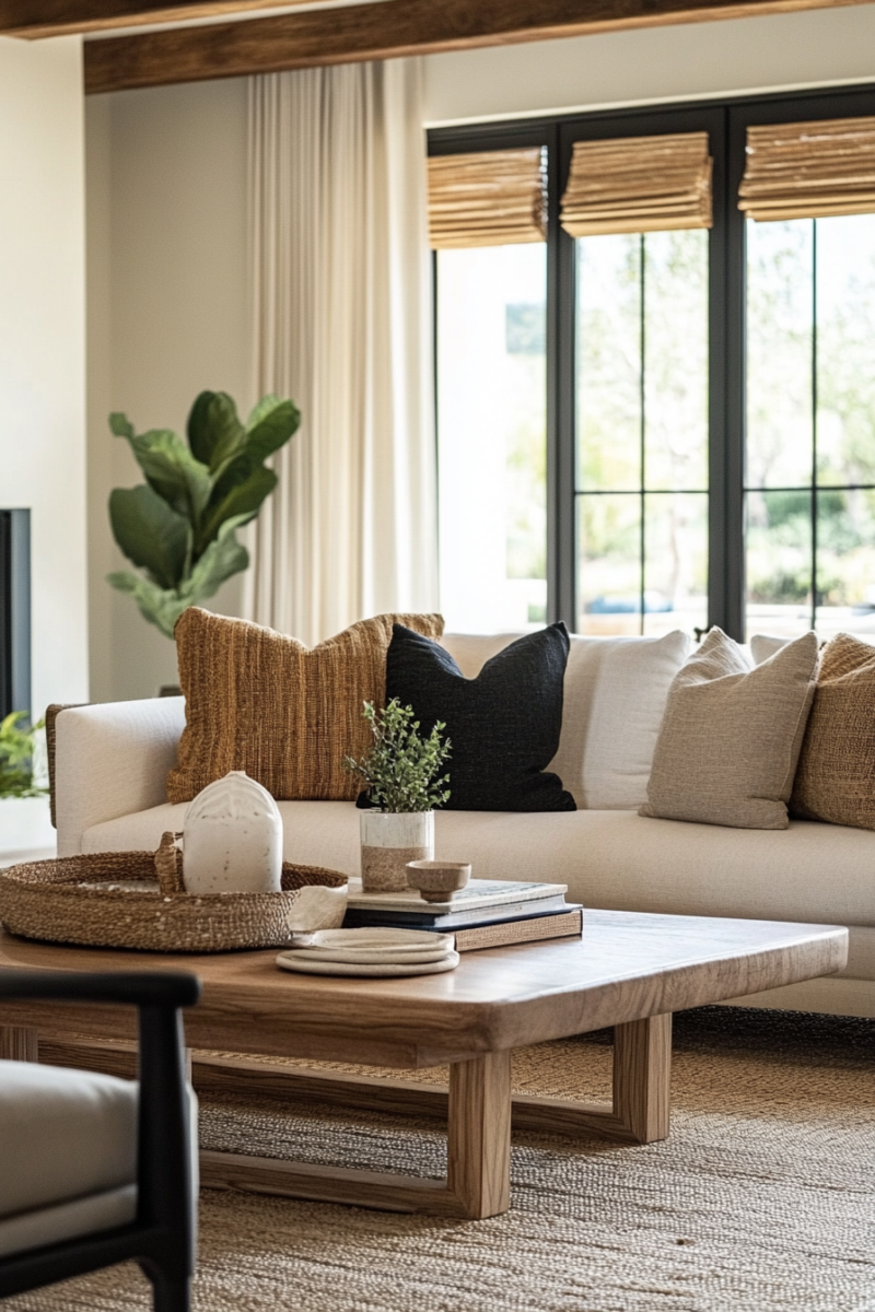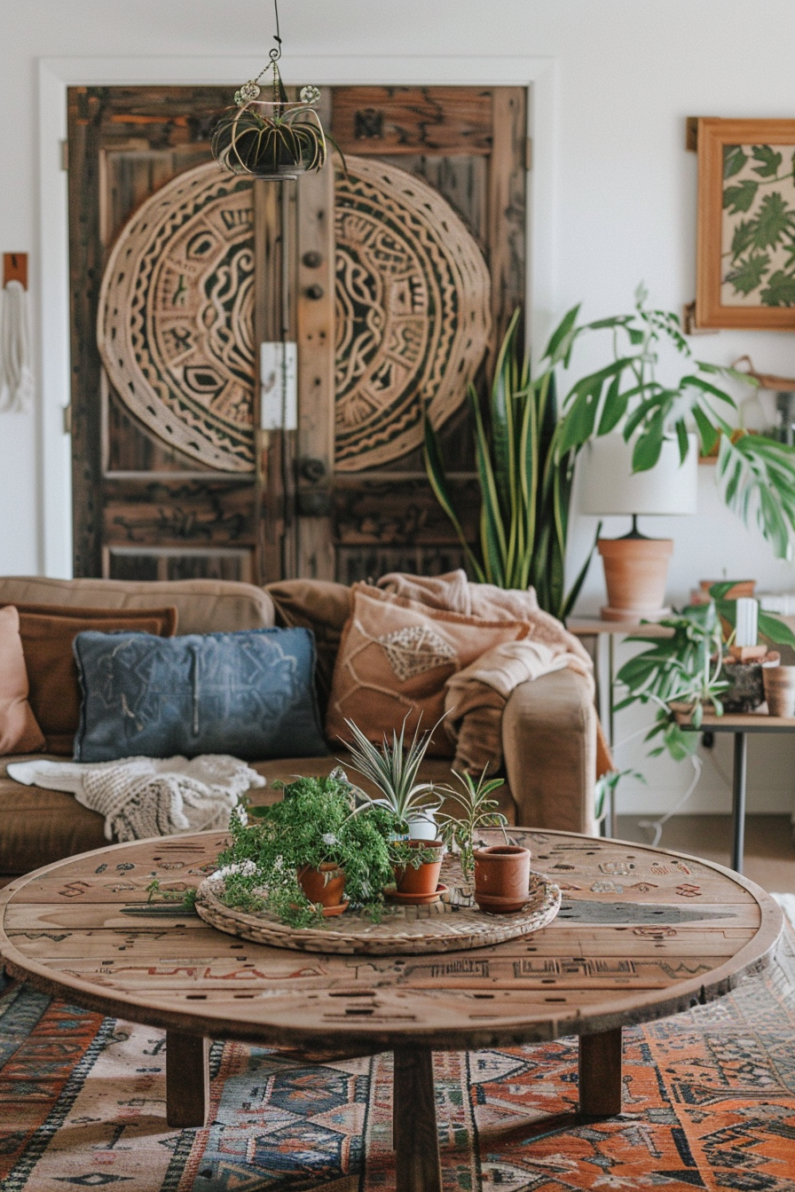 Complement the coffee table with a plush, neutral-colored sofa adorned with an array of textured throw pillows in earthy hues and ethnic patterns.
