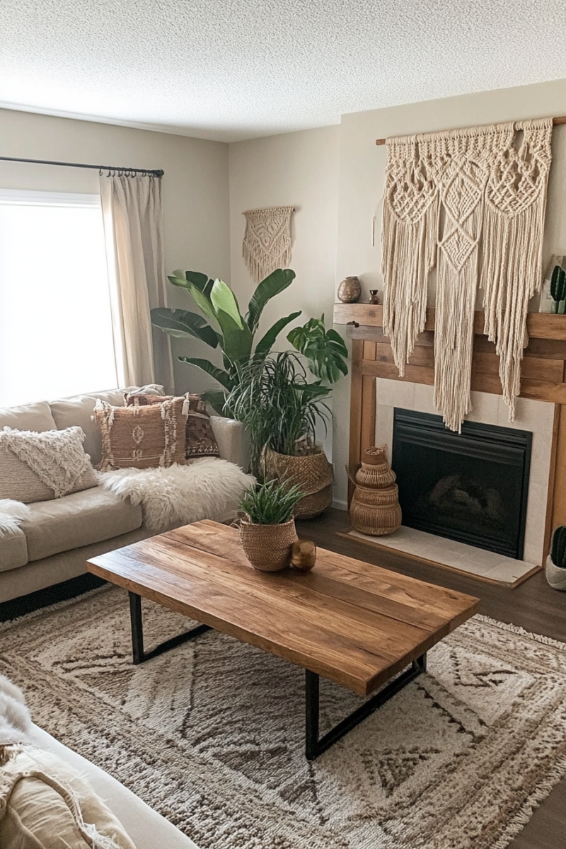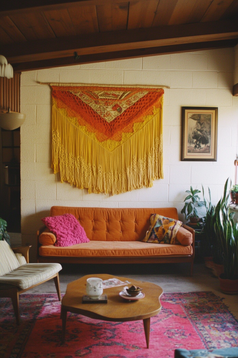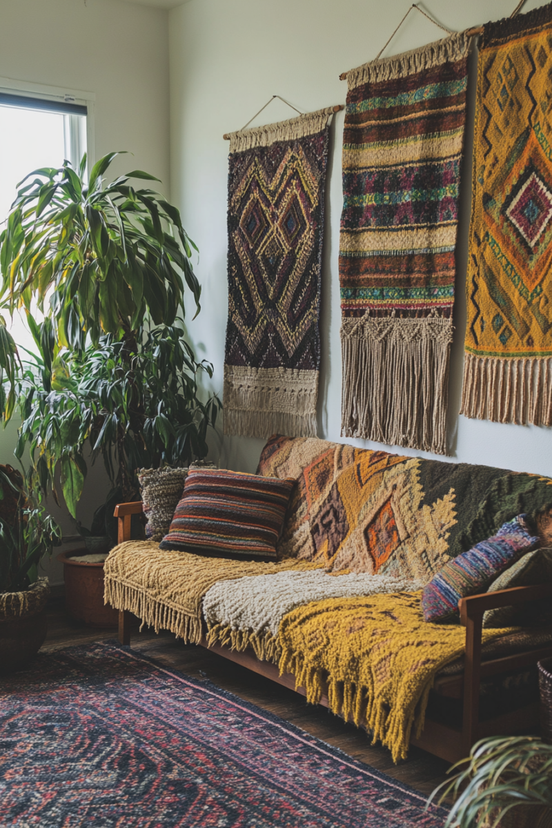 Woven wall hangings and macramé are essential elements of bohemian decor that add texture, warmth, and visual interest to your midmod-boho living room.