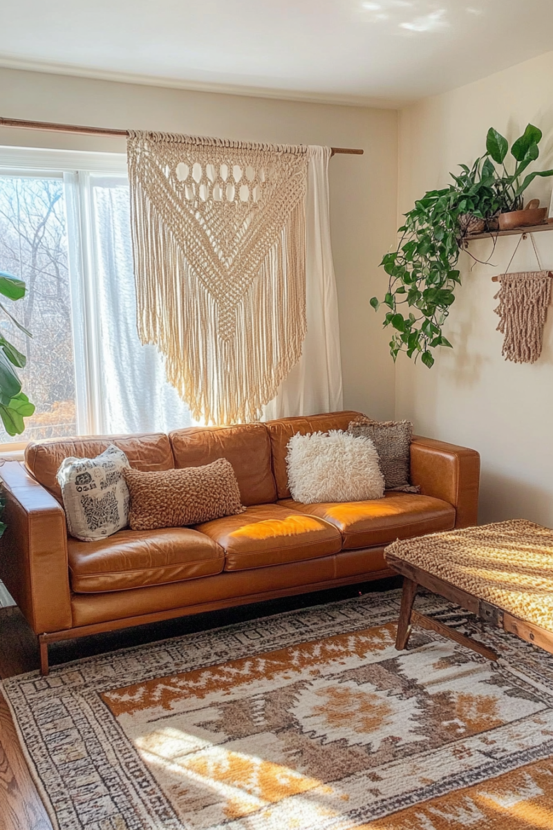 In addition to a large wall hanging, incorporate several smaller macramé pieces throughout your living room to create a cohesive, layered look.