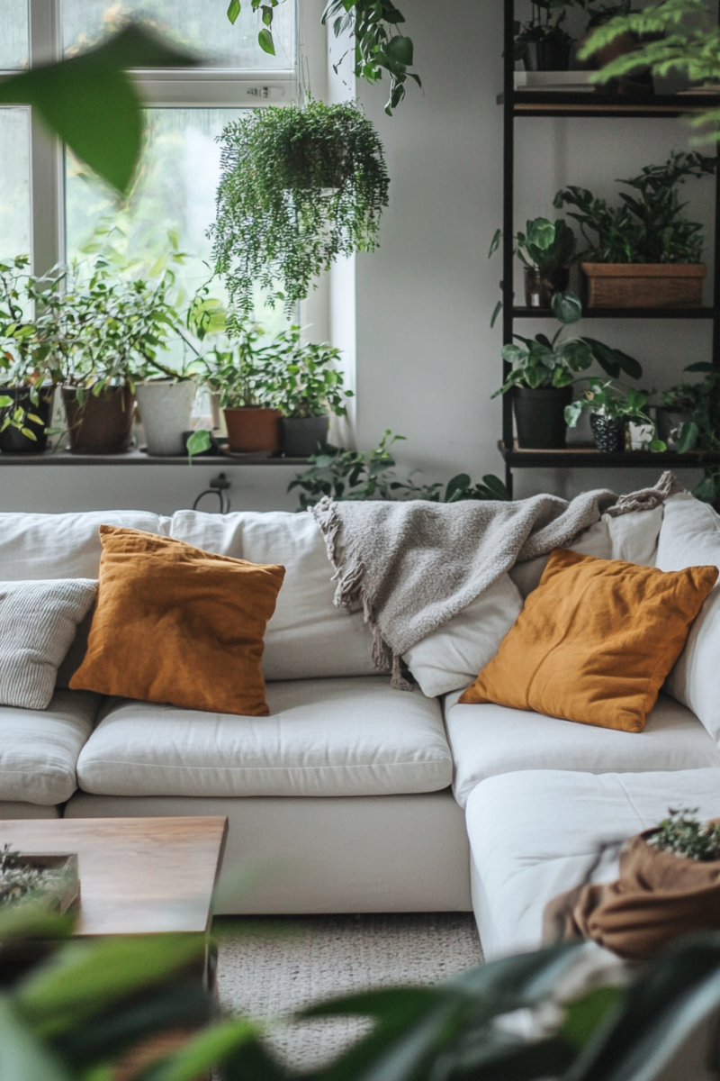 Arrange your plants throughout the living room, placing larger ones in corners or next to furniture, and clustering smaller ones on shelves, side tables, or even hanging from the ceiling in macramé plant hangers.