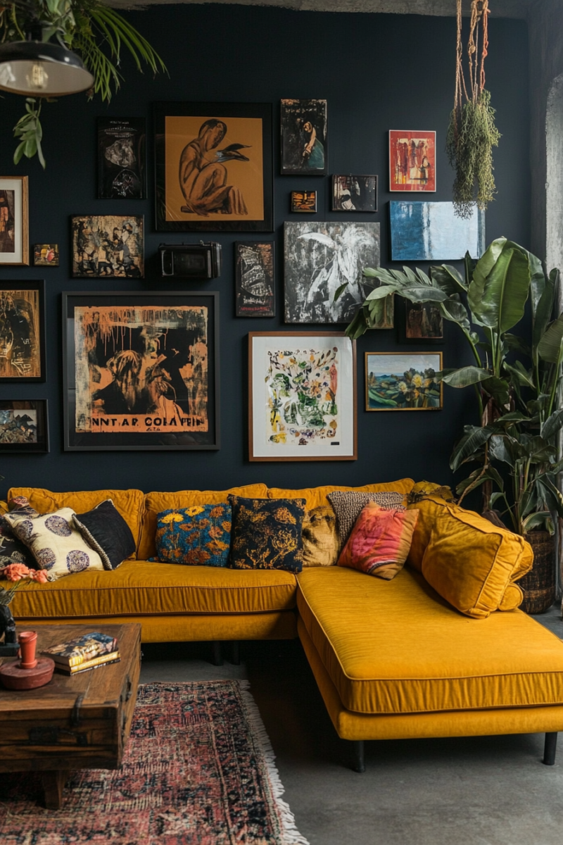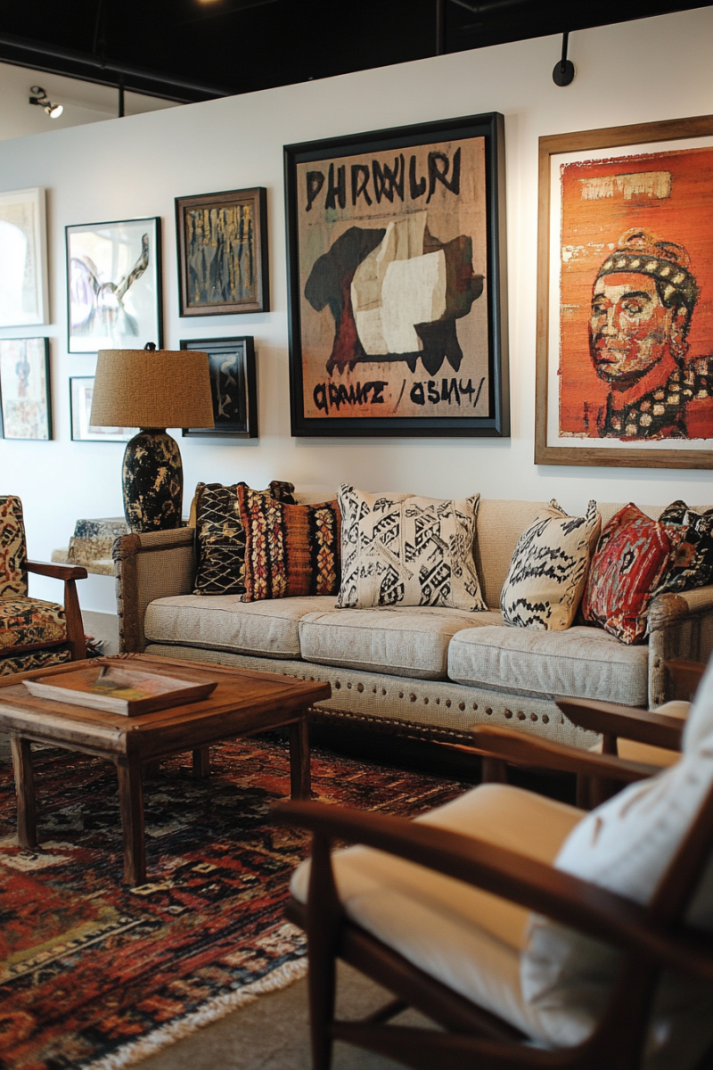 Hang a gallery wall featuring a mix of abstract prints, vintage photographs, and colorful paintings that reflect your personal style and add visual depth to the room.