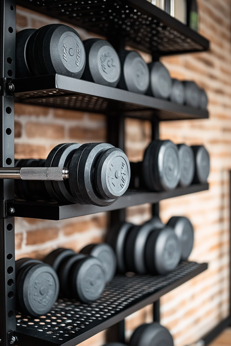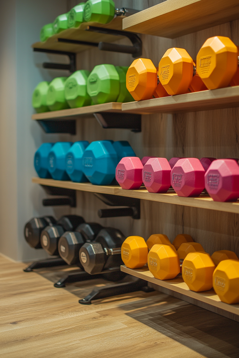 To make the most of limited space, mount a vertical rack or shelf on the wall to store the dumbbells.