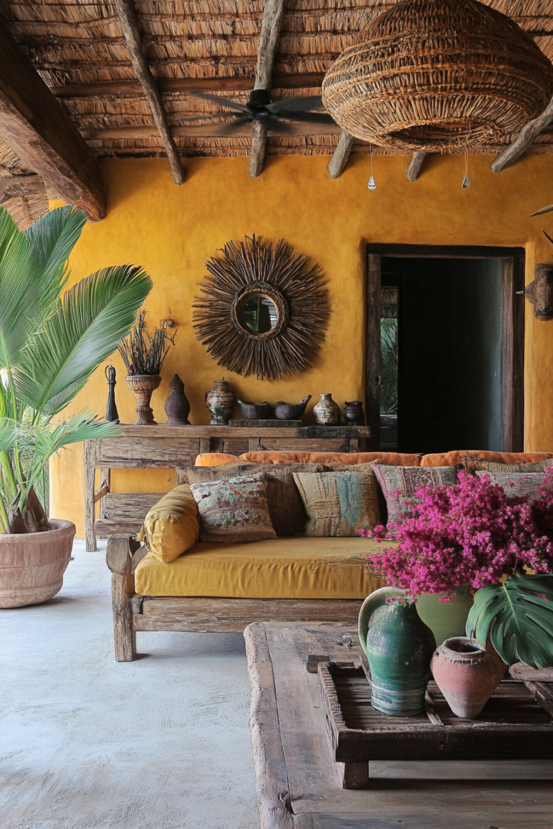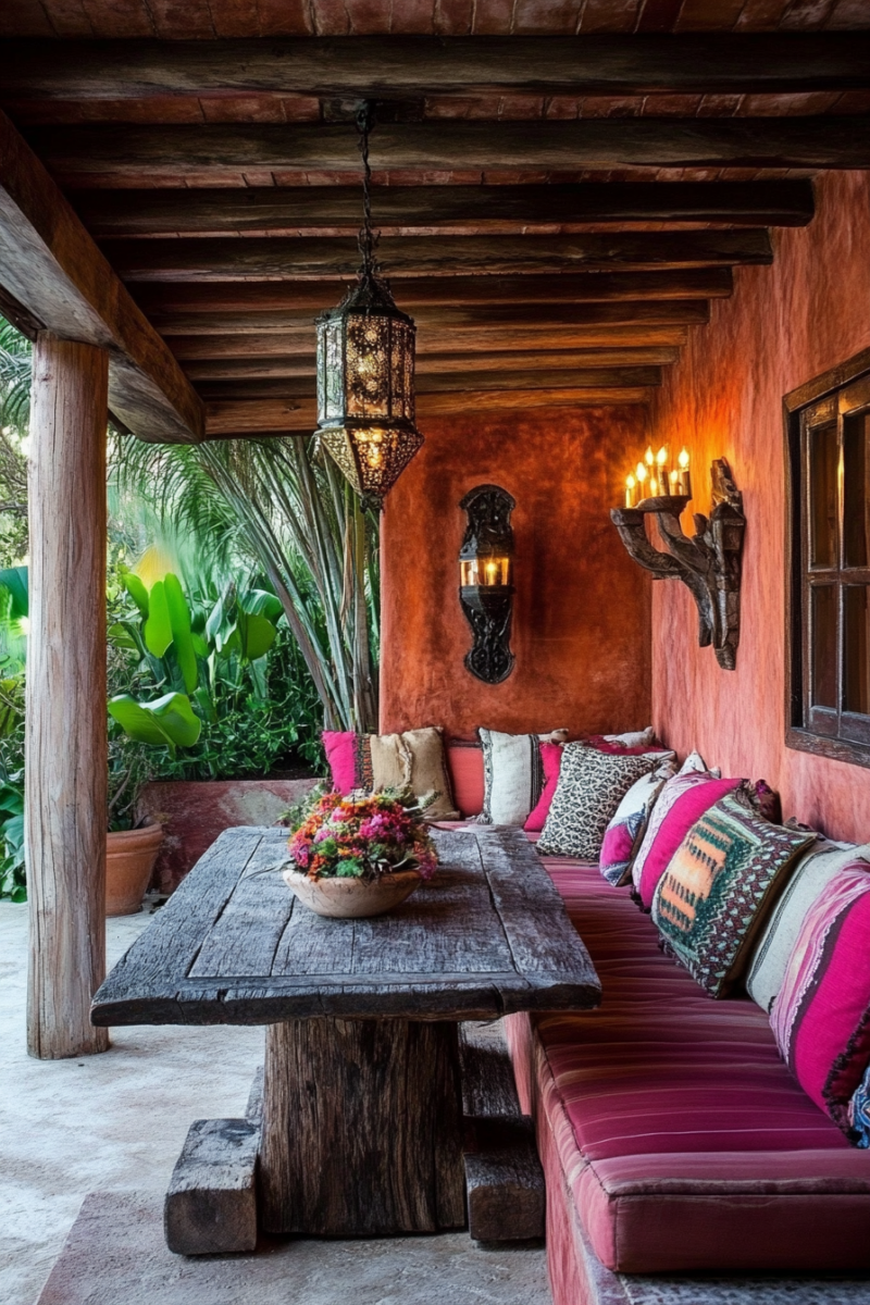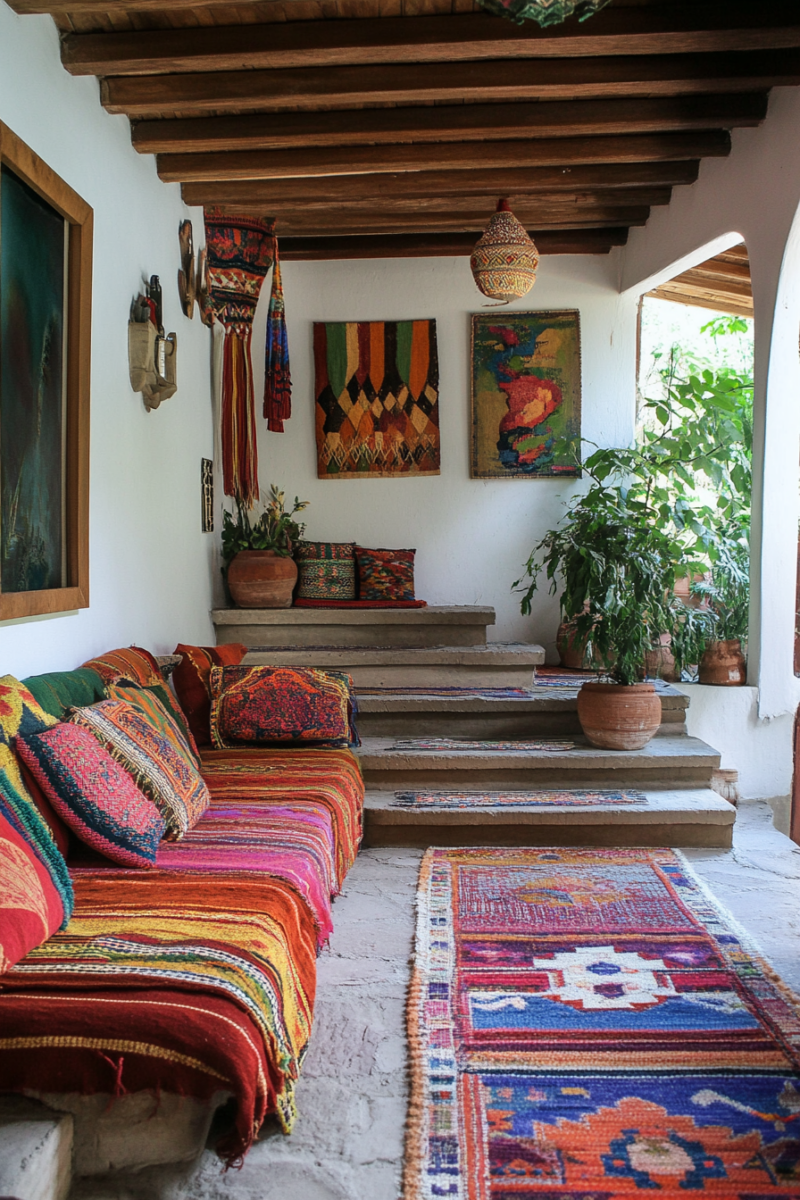 Include cozy seating, vibrant textiles, rustic and colorful accents, and lush plants.