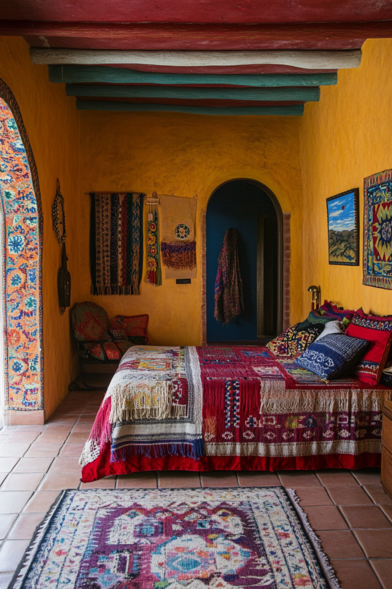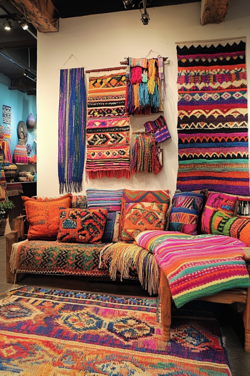 Consider hanging woven blankets, embroidered tapestries, or colorful quilts for pops of pattern.
