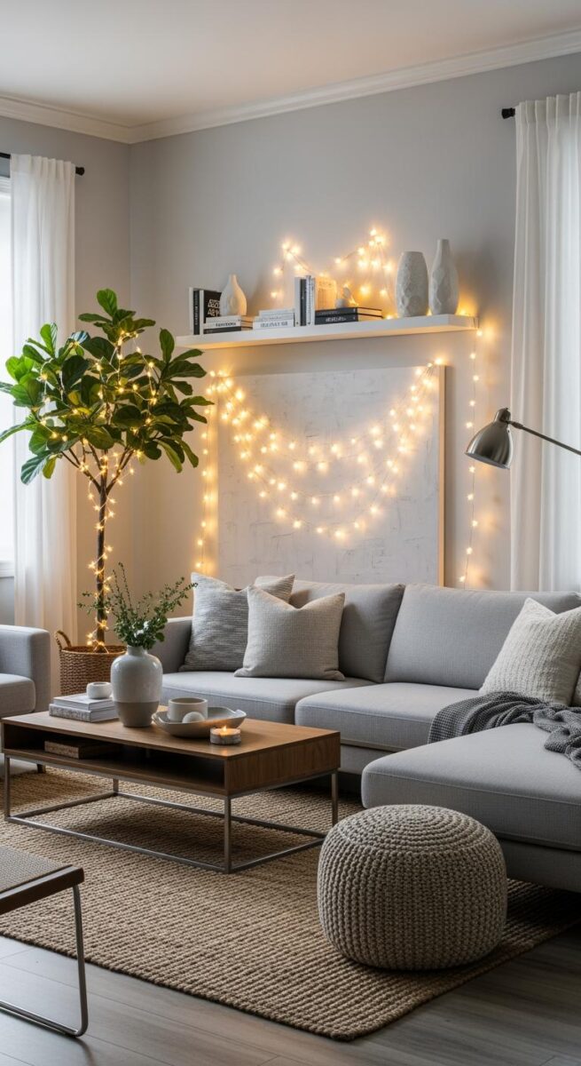 If you want your living room to feel like a cozy hideaway, string lights are honestly one of my secret weapons.