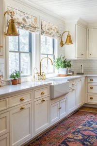 For a softer contrast, incorporate painted brick, marble counters, and floral accents like area rugs and curtains.