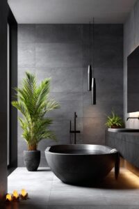 Finally, punctuate your understated palette with a single rich paint color like navy or emerald on the vanity or ceilings for a pop of drama.