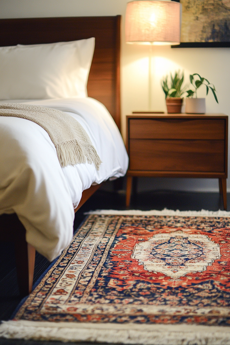 For clutter-free style, choose sleek midcentury furniture so the rug can shine.