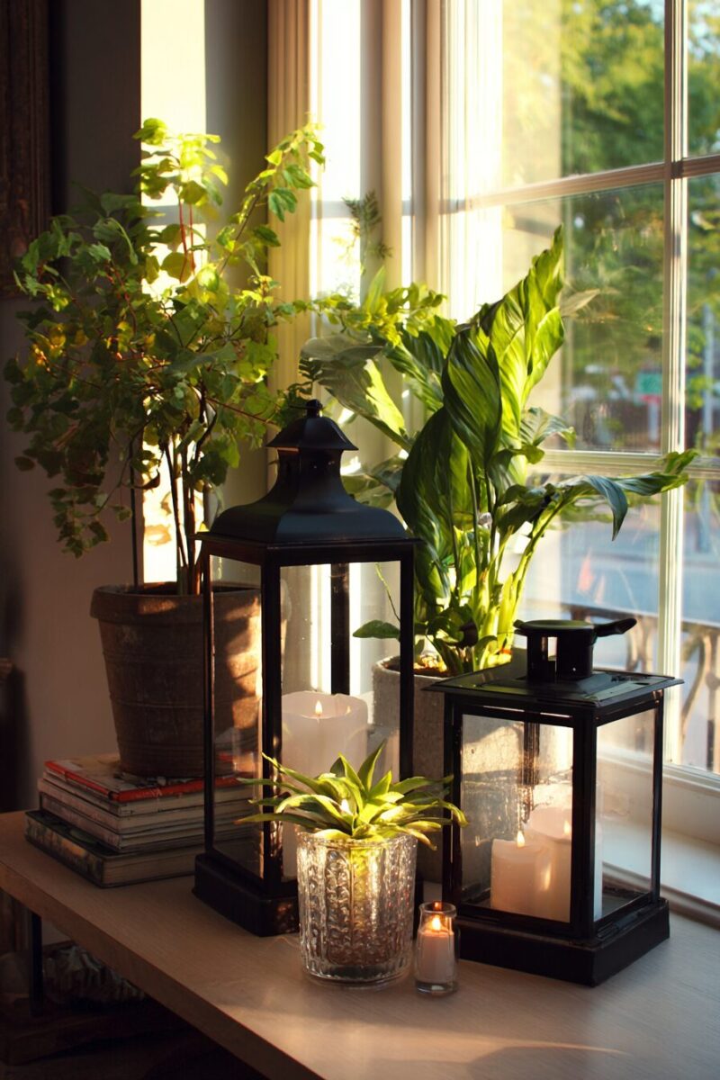 You can place small potted succulents inside larger open lanterns for unexpected living terrariums that blend structure and organic elements.