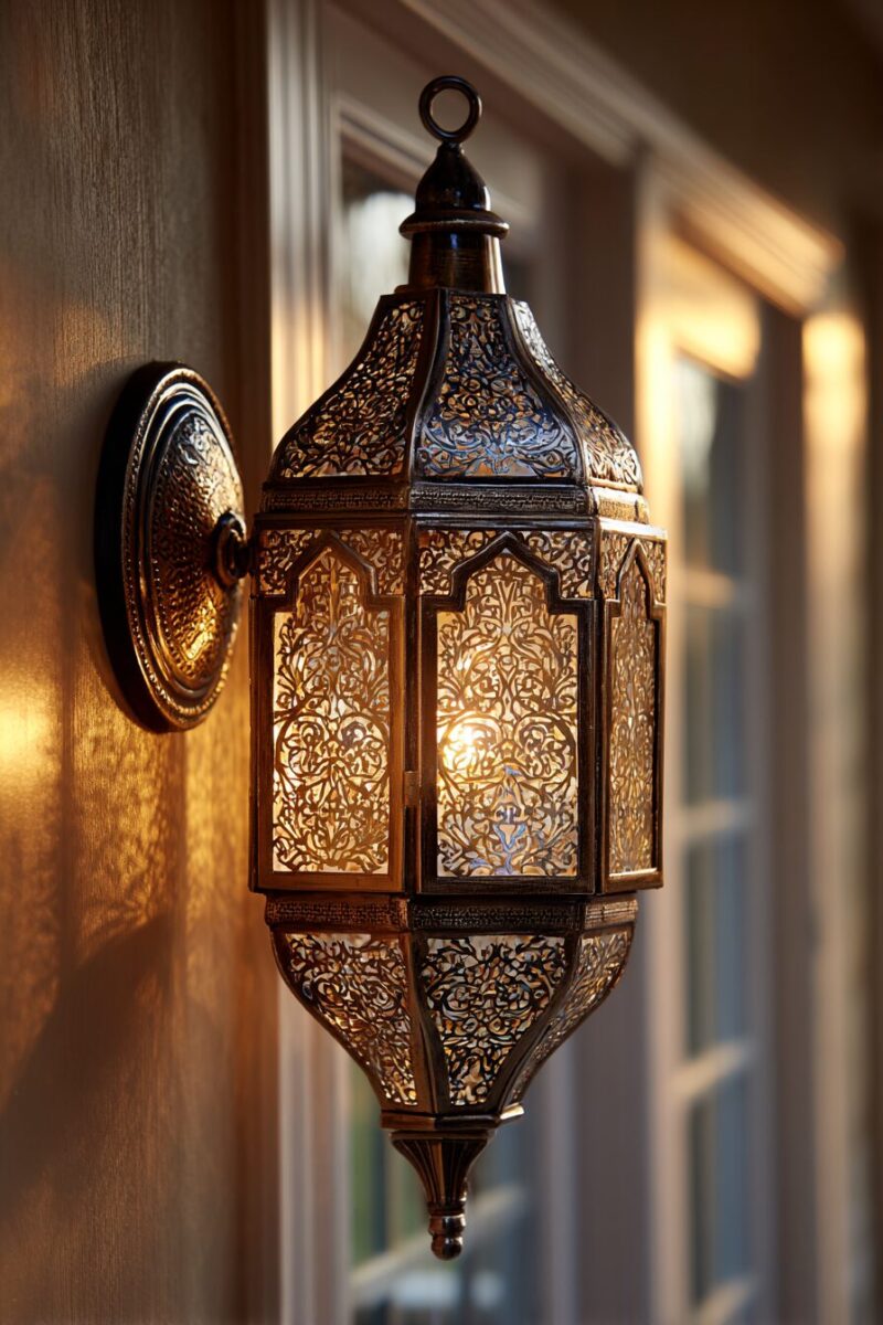 Moroccan wall sconces turn ordinary walls into dynamic canvases of light and shadow with their intricate cutout patterns.