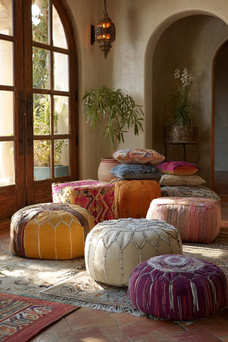 For outdoor spaces, weather-resistant poufs bring the Moroccan riad feeling to your patio or garden, creating exotic lounging areas under the open sky.