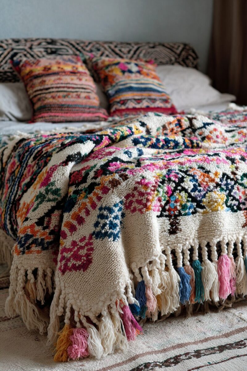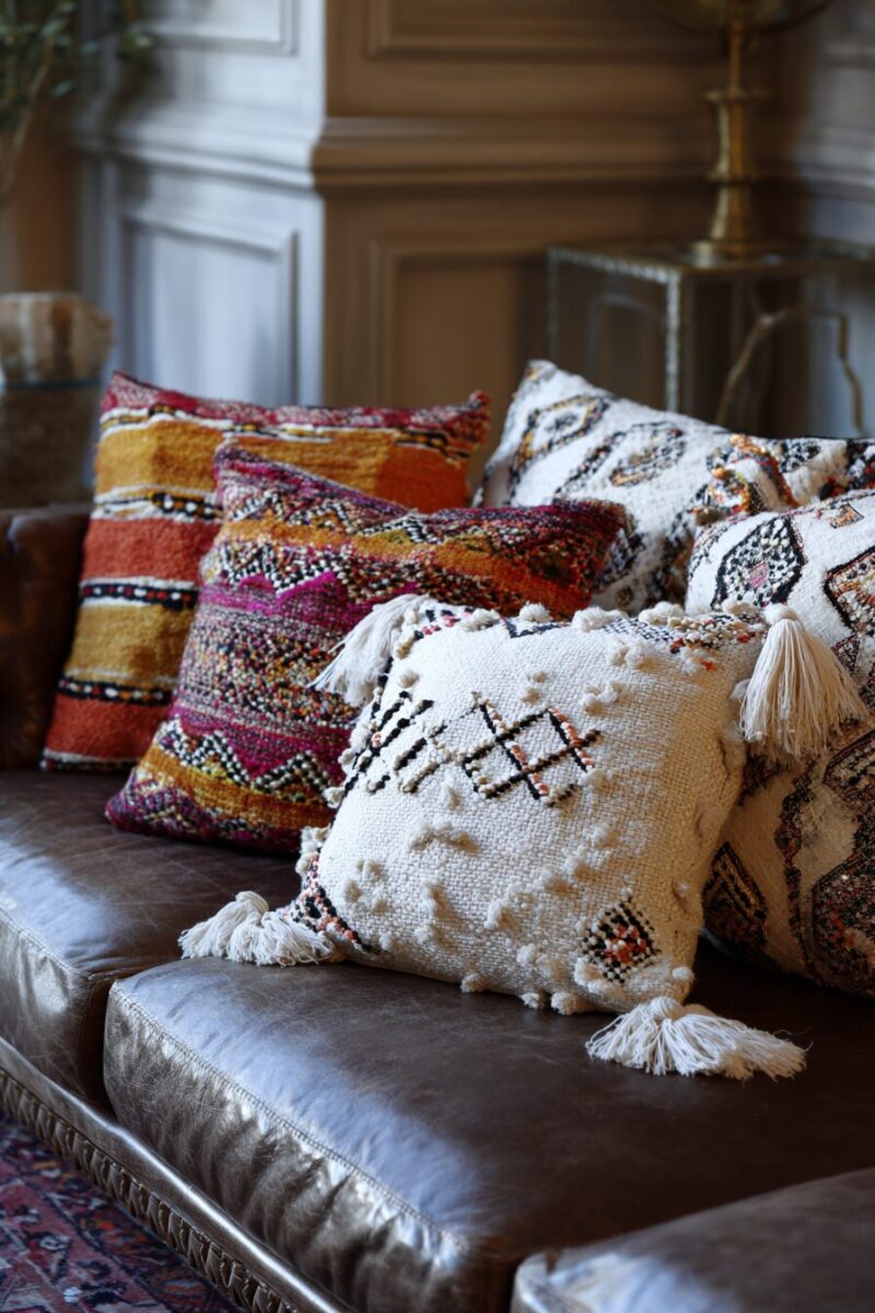 You can mix pillows made from different Moroccan textiles—combining smooth silk embroidery, nubby wool weaves, and metallic threaded pieces—to create rich textural contrast.