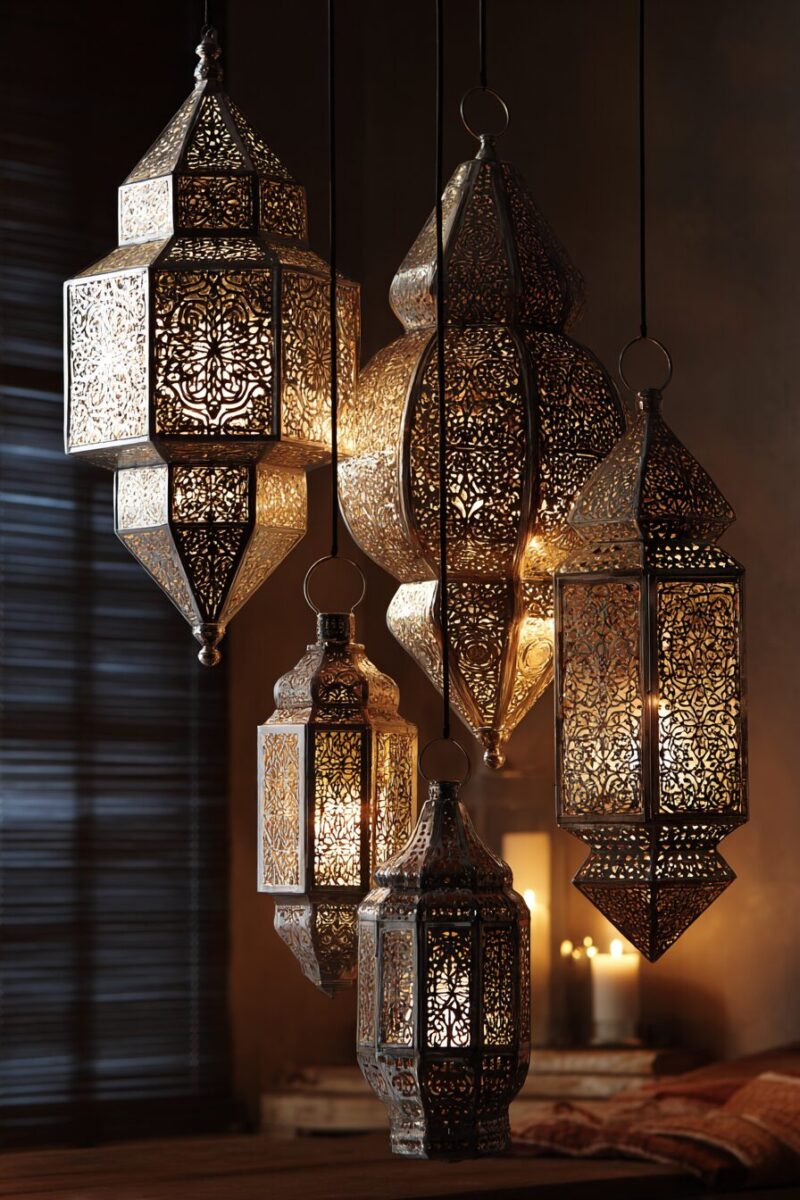 Grouping multiple Moroccan lanterns at varying heights creates a customized light installation that rivals expensive designer lighting at a fraction of the cost.