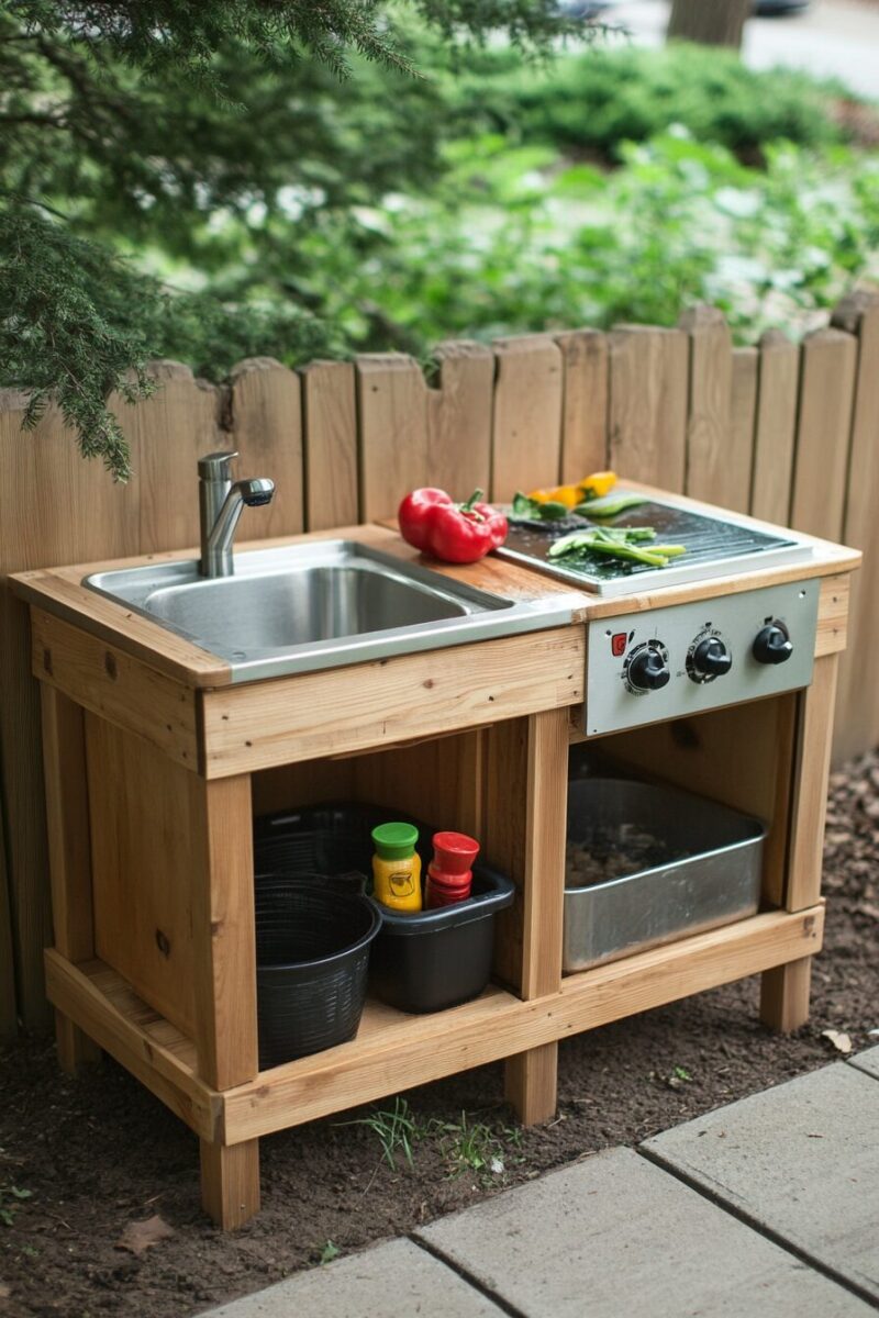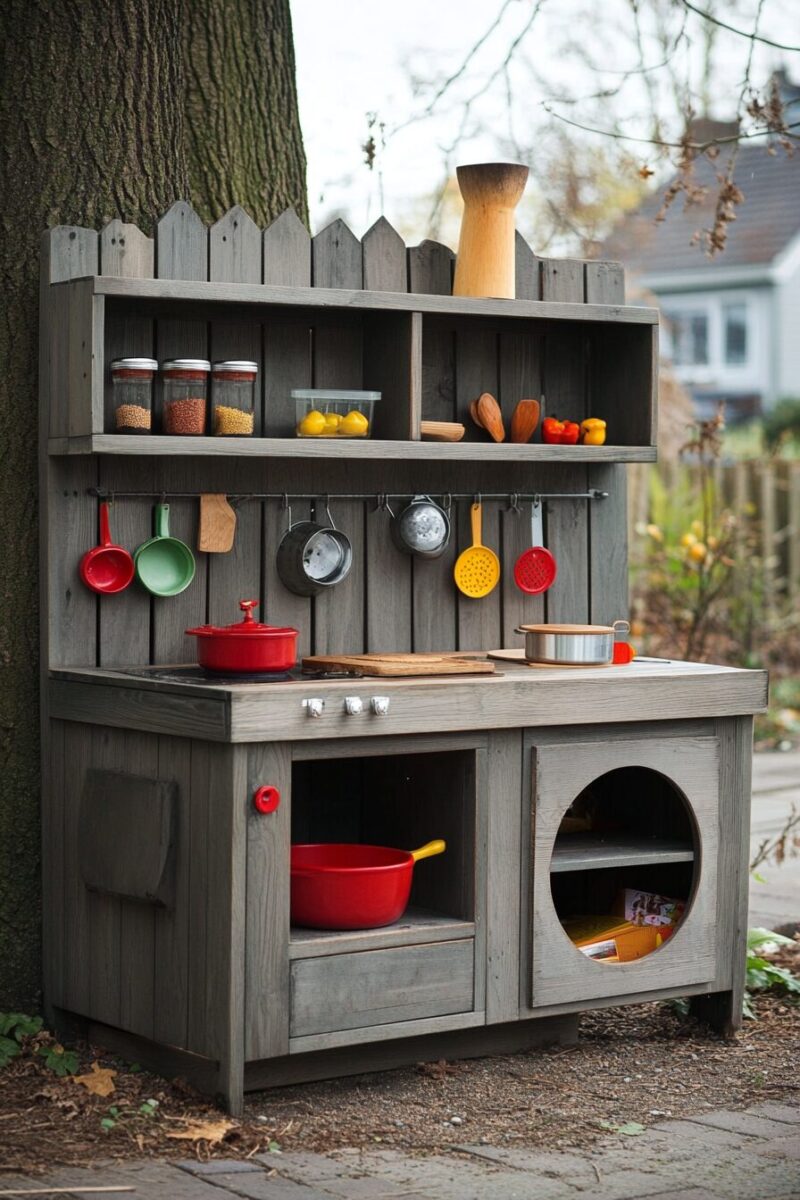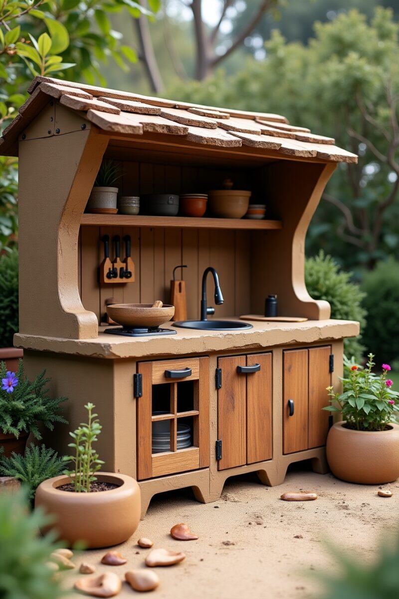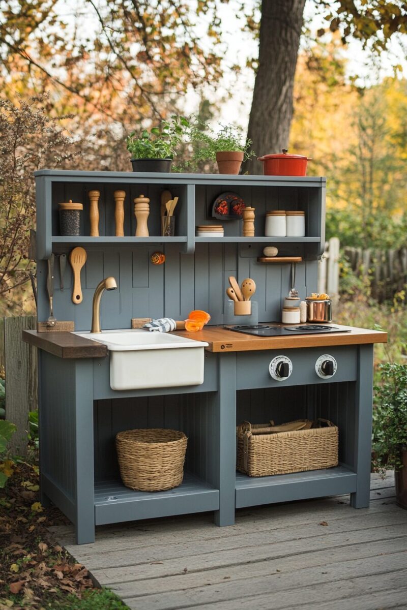 Take this kitchen to the next level by attaching an old faucet connected to a rainwater barrel, providing a renewable water source for mud-making adventures.