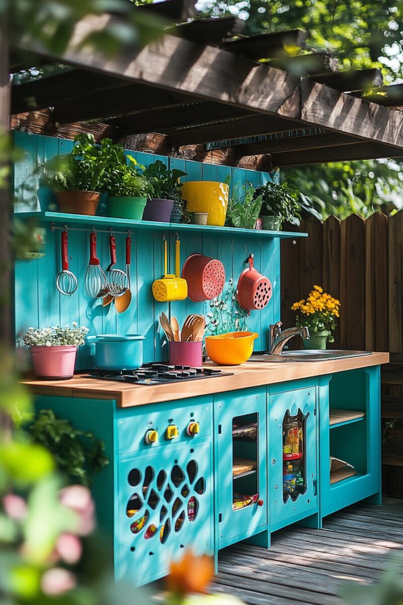 Paint the kitchen in weatherproof, child-safe colors that complement your outdoor space – earthy tones blend beautifully with natural surroundings.
