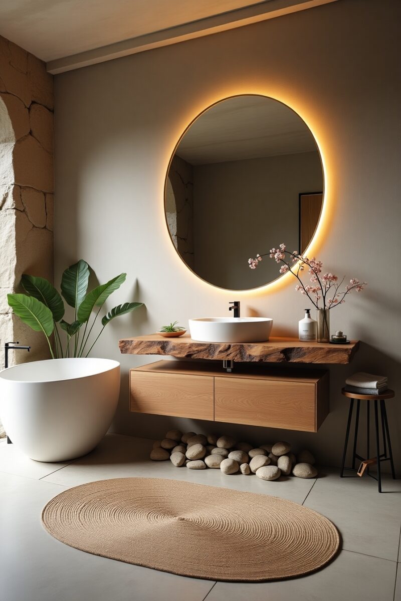 Natural sponges, wooden brushes, and stone soap dishes are small touches that reinforce the organic aesthetic.