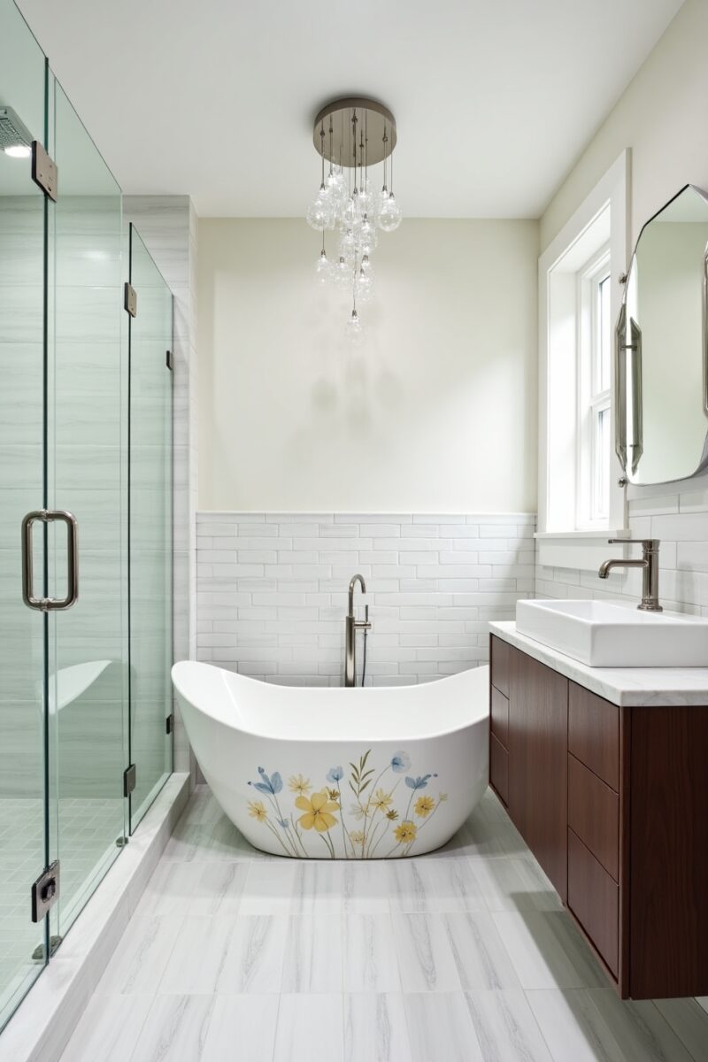Art in bathrooms should be chosen carefully – consider vintage botanical prints, black and white photography, or abstract pieces that can withstand humidity.