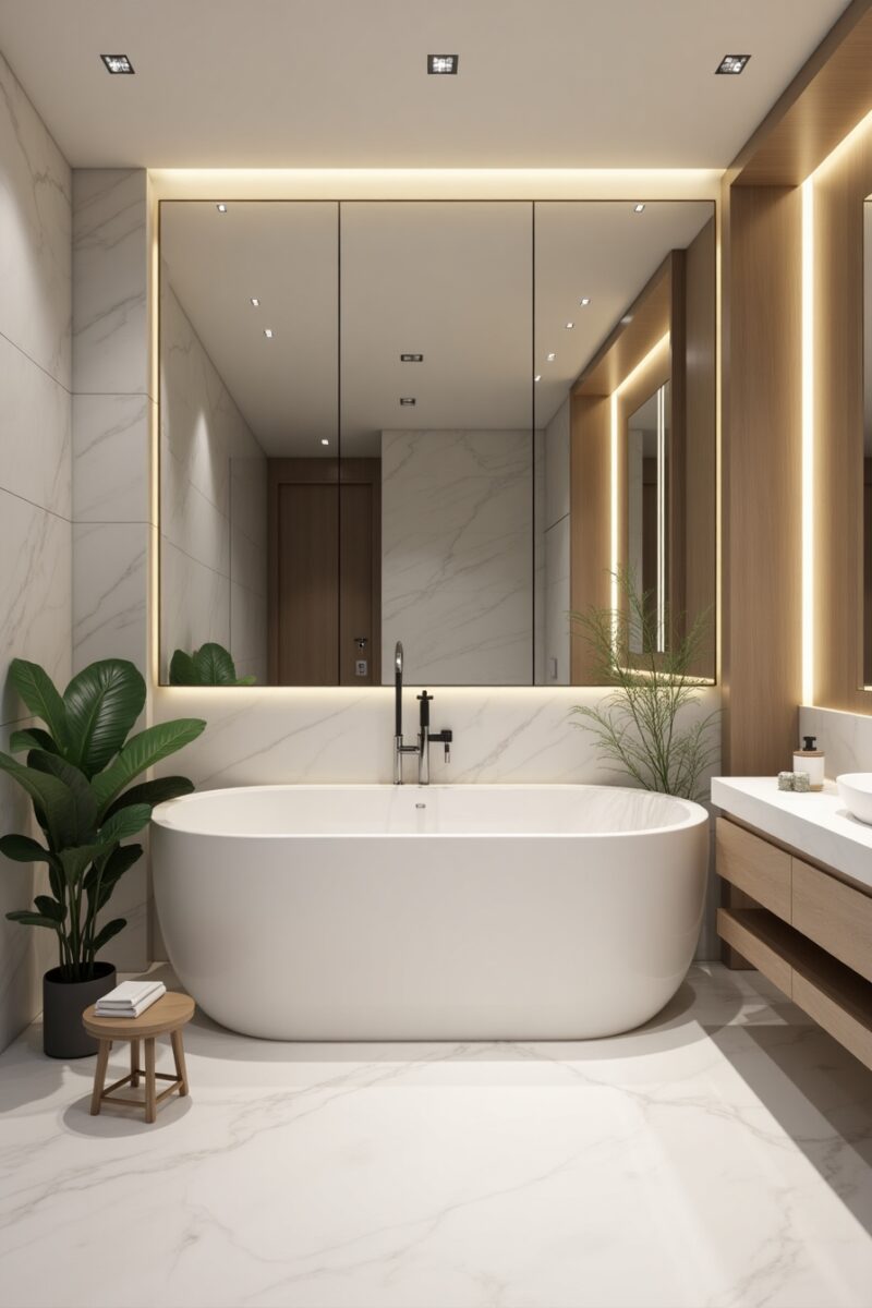Add warmth with natural wood elements like a teak bath mat or wooden stool that prevents the space from feeling clinical.